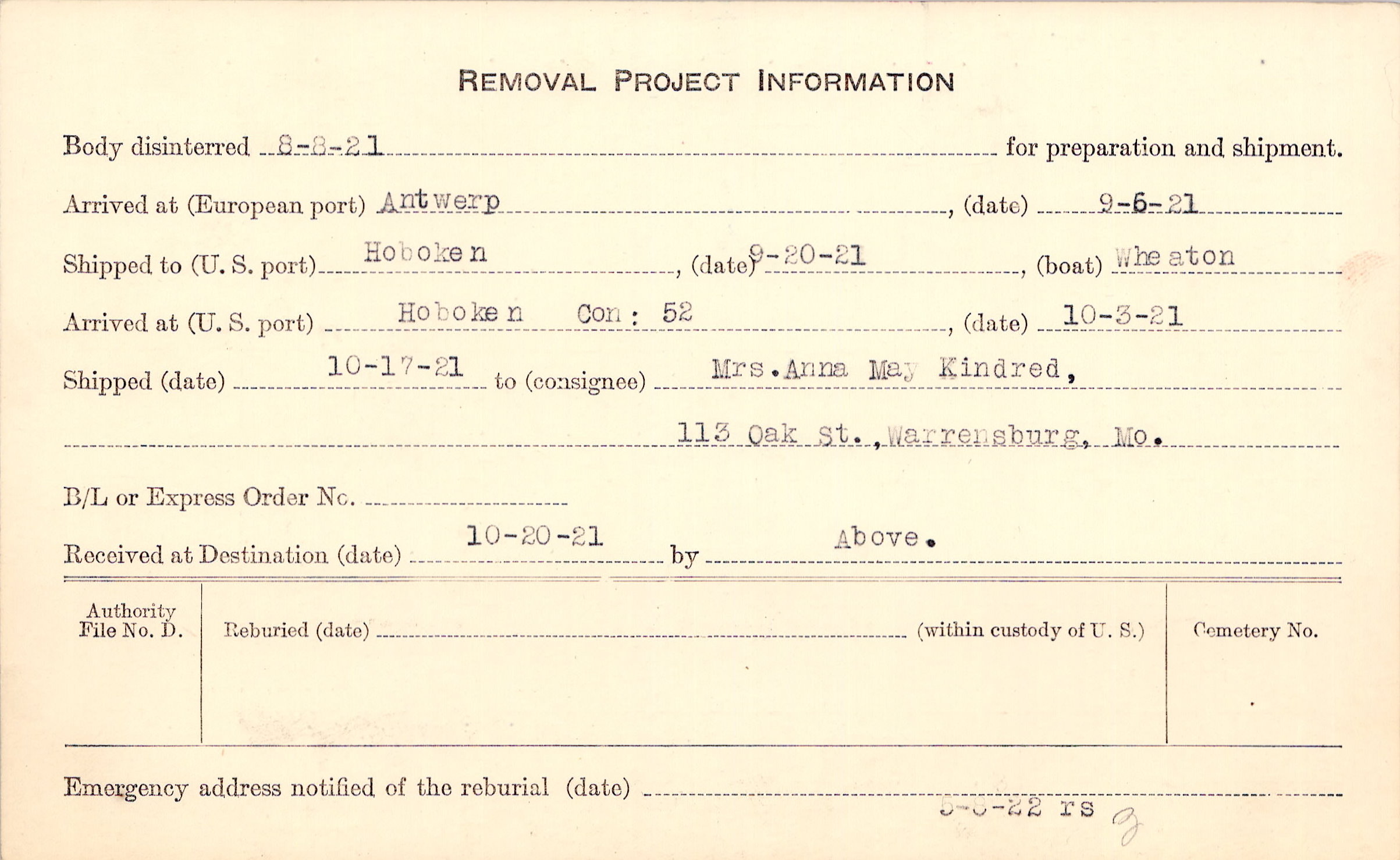 Anna Kindred (Wife), 113 Oak Street, Warrensburg, Mo.