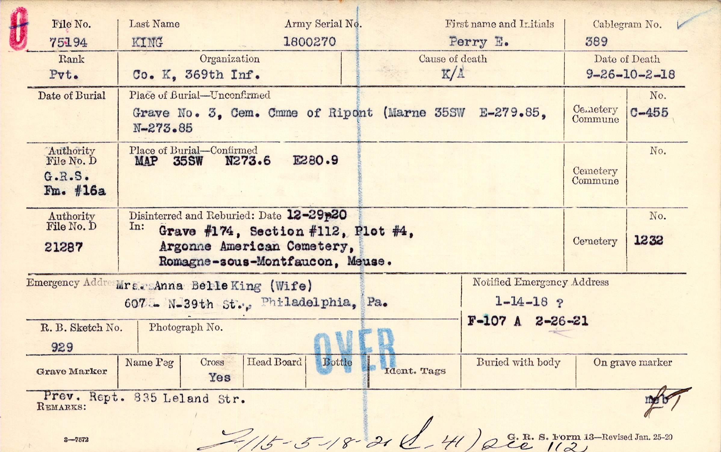 Mrs. Anna Belle King (Wife), 607 - N-39th St., Philadelphia, Pa.