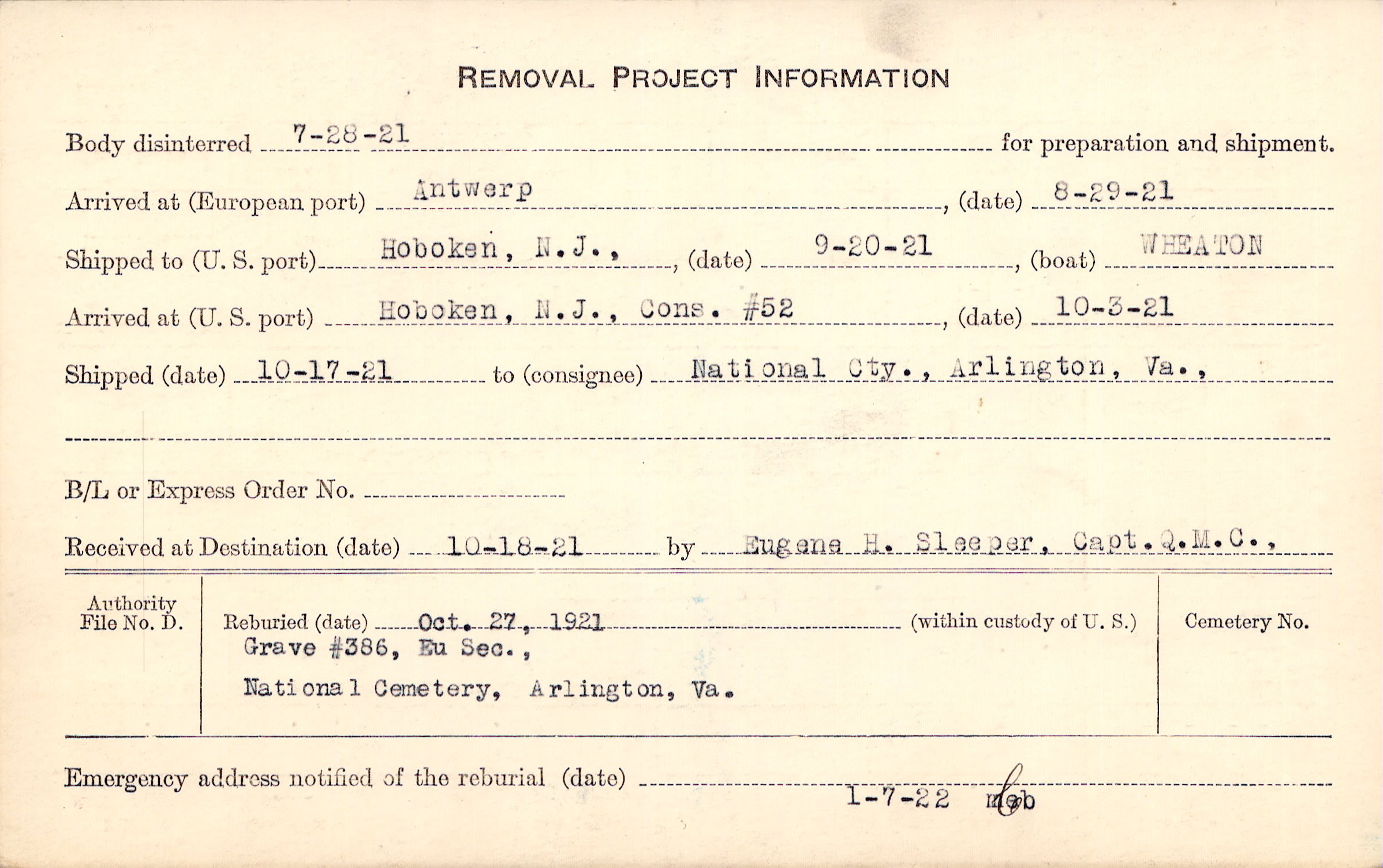Body disinterred 7/28/1921 for preparation and shipment.