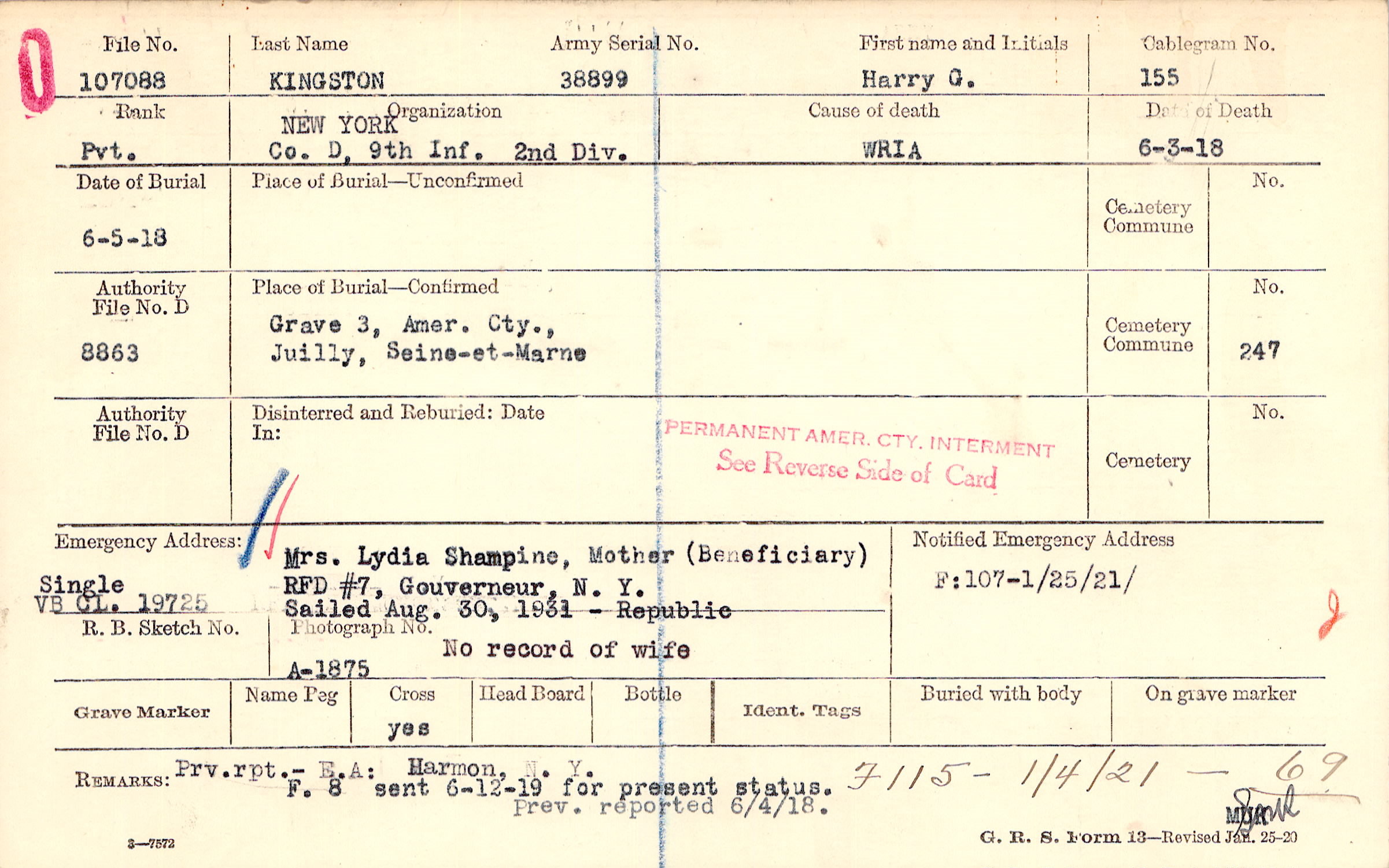 Mrs. Lydia Shampine, Mother, RFD #7, Gouverneur, N.Y., (Beneficiary) Single VB CL. 19725 Sailed Aug. 30, 1931 - Republic No record of wife