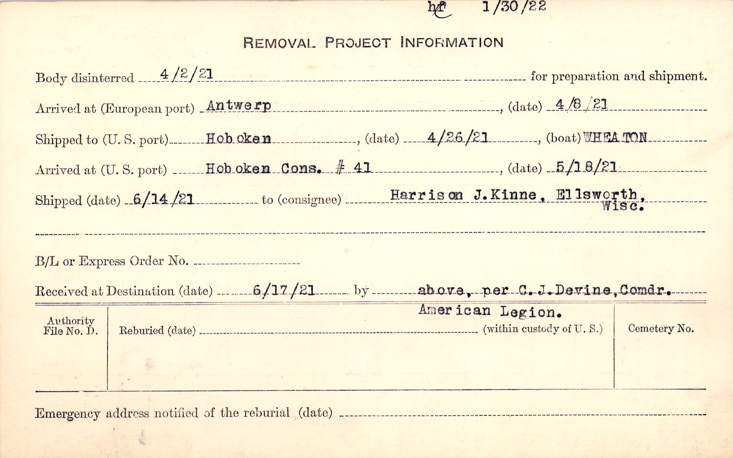 Body disinterred 4/2/1921 for preparation and shipment.