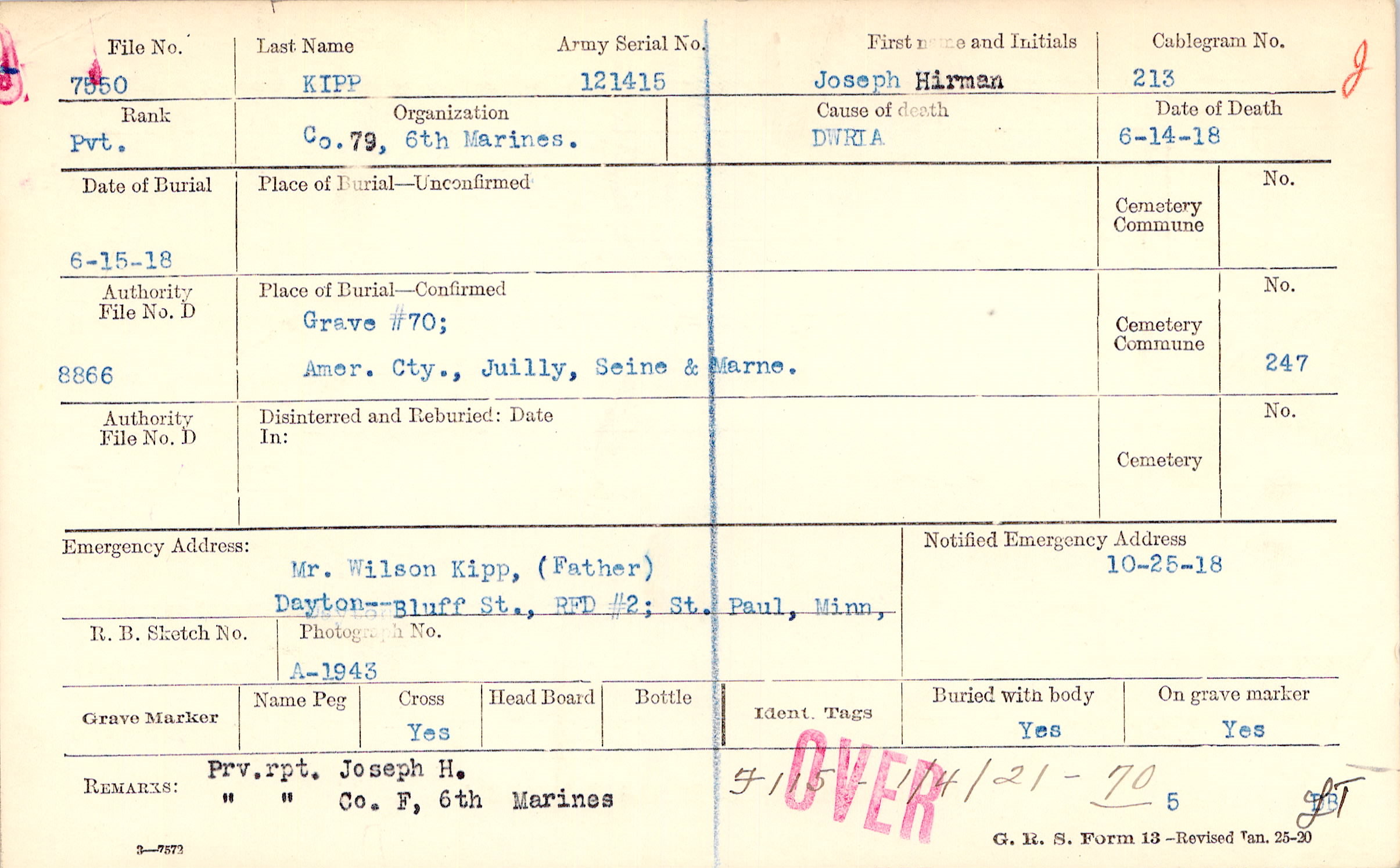 Grave #70, Amer. Cty., Juilly, Seine & Marne.