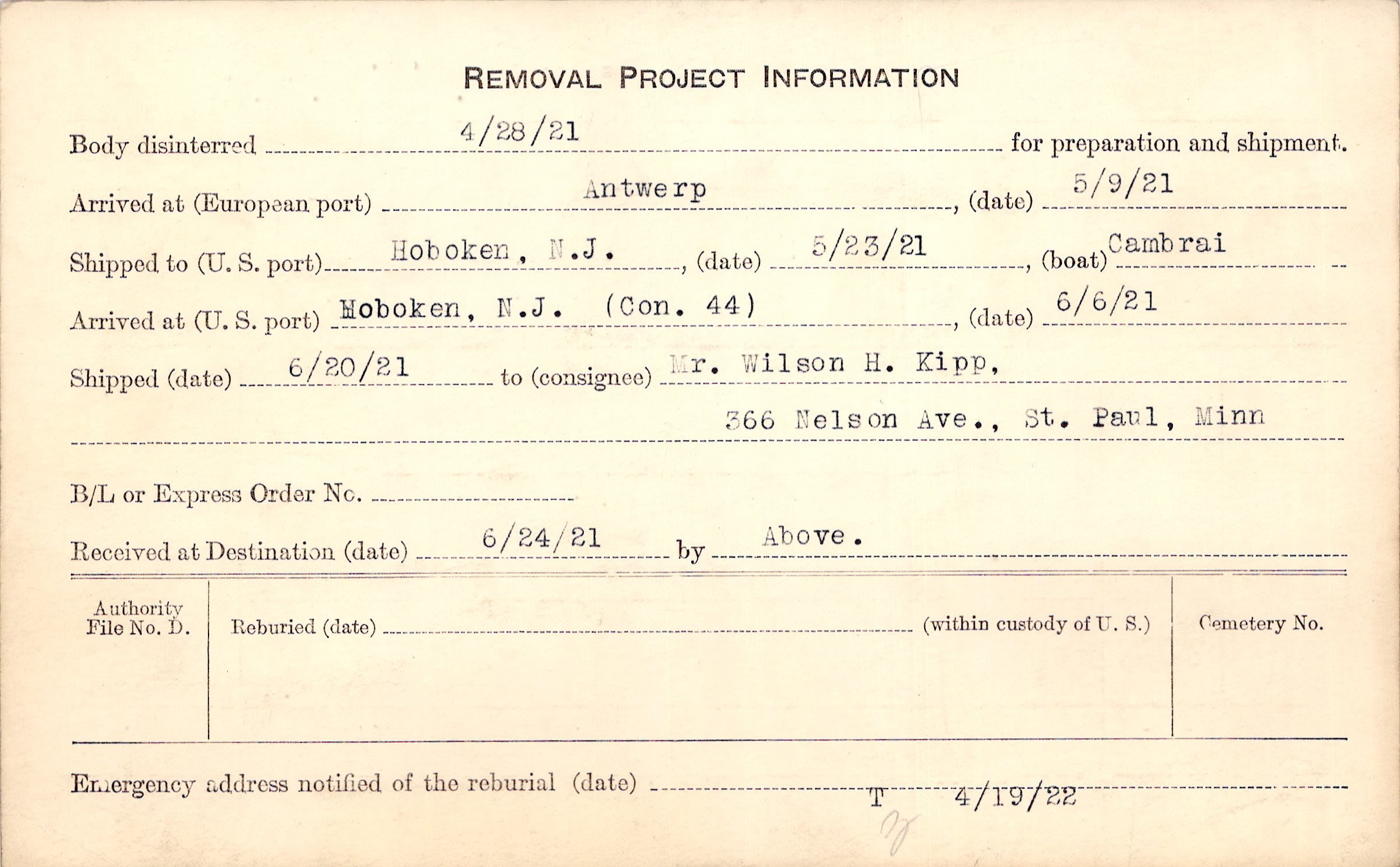 Body disinterred 4/28/1921 for preparation and shipment.