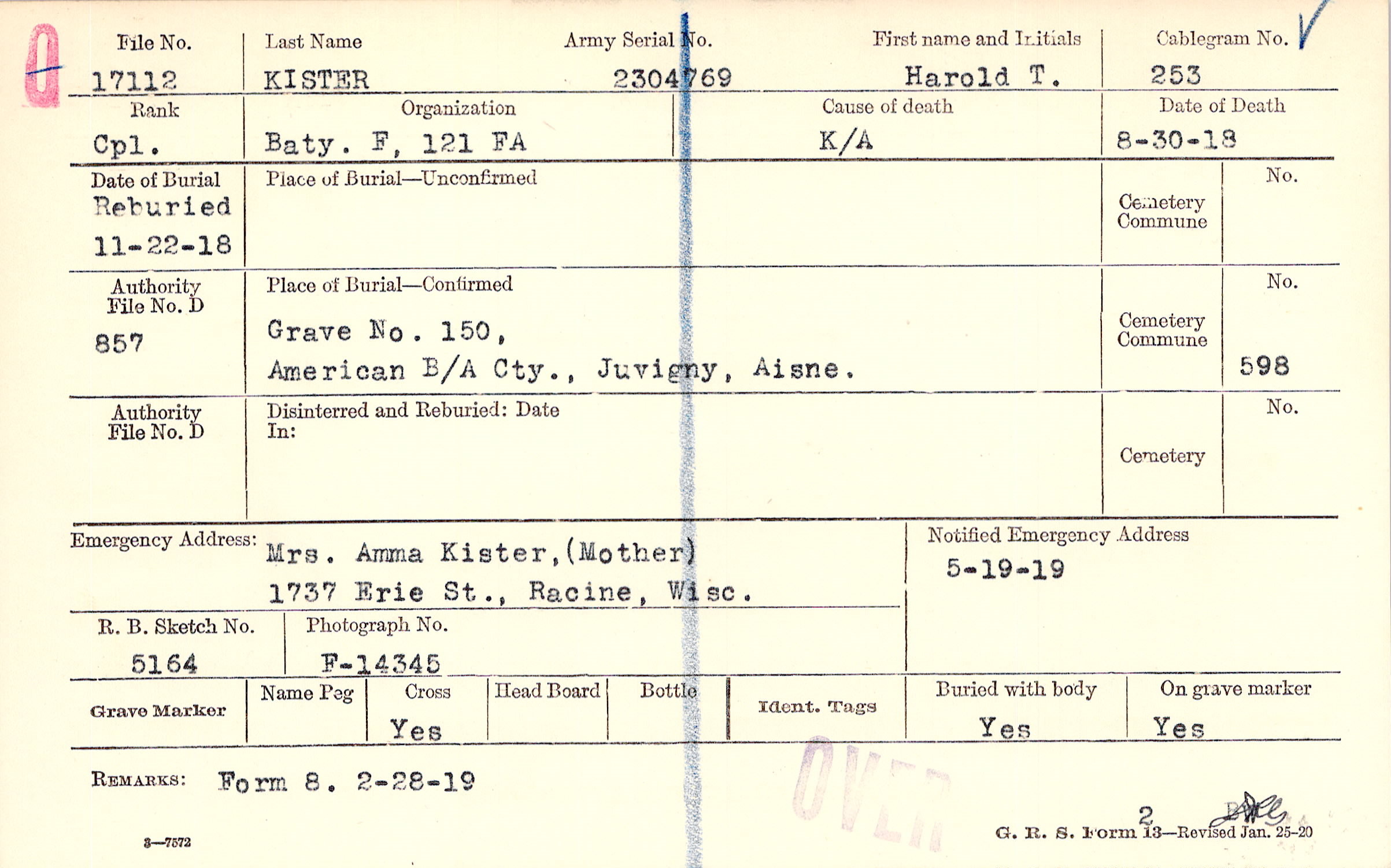 Mrs. Amma Kister,(Mother), 1737 Erie St., Racine, Wisc.