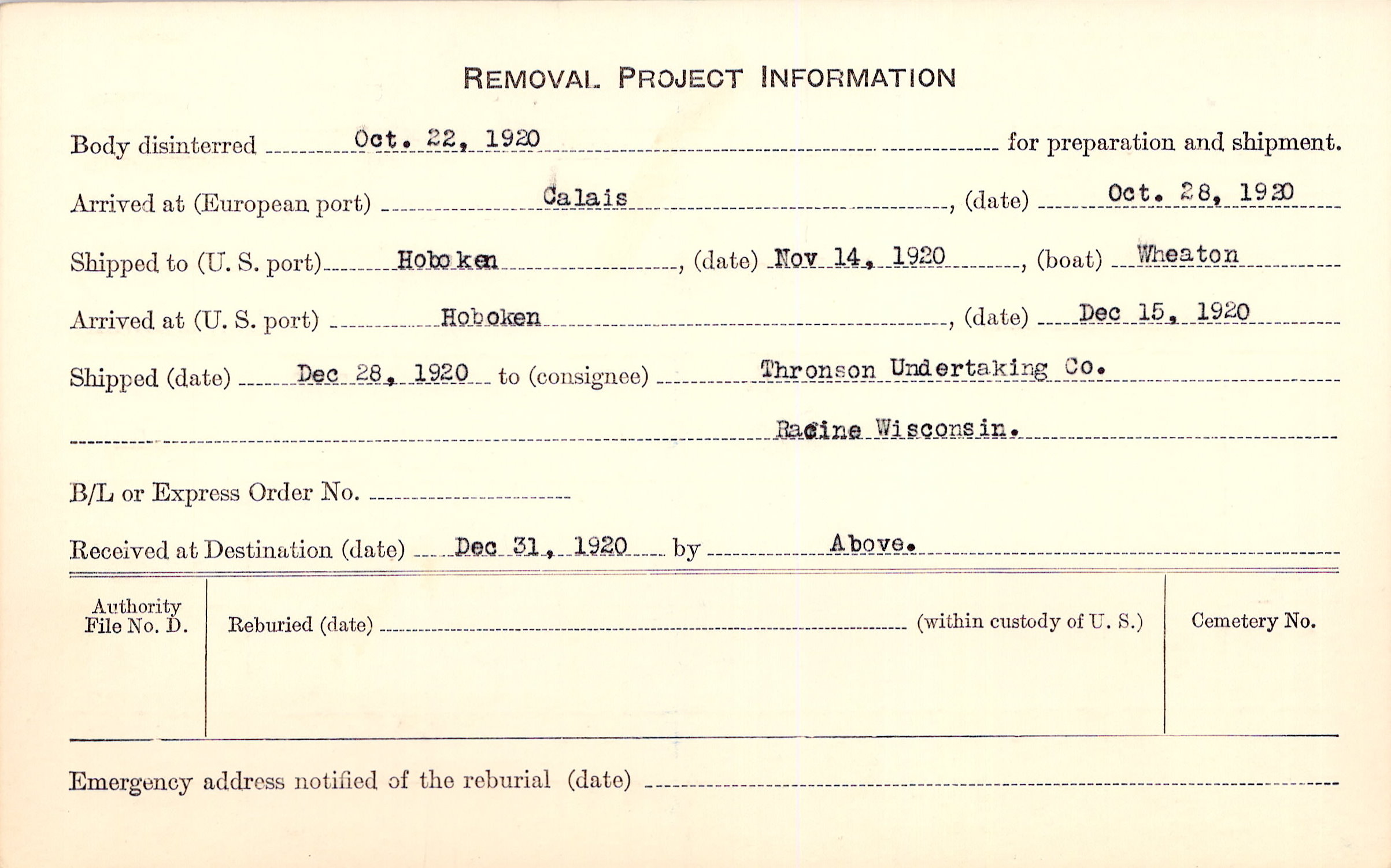 to Thronson Undertaking Co., Racine, Wisconsin.