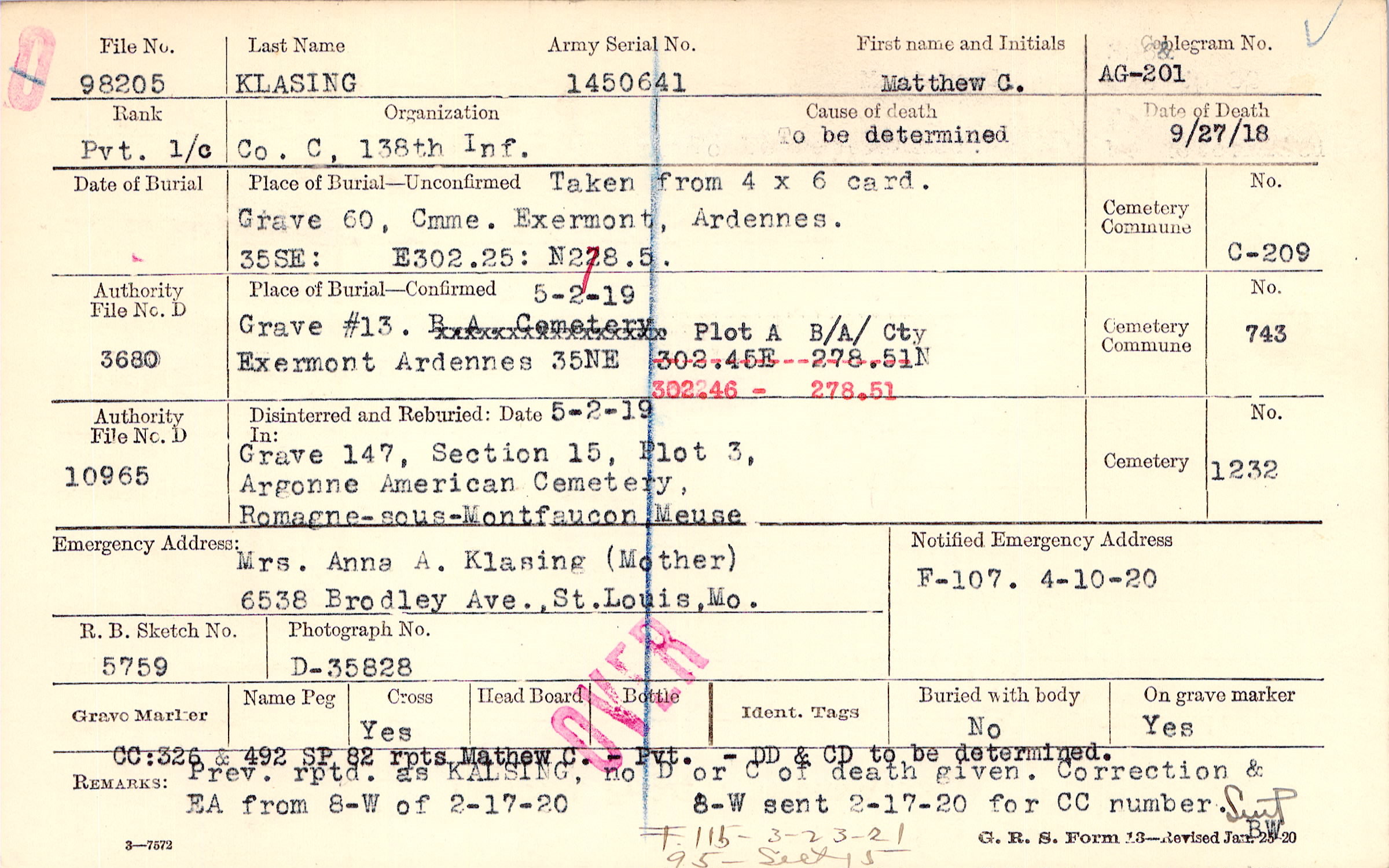 Grave #13, 5-2-19, Plot A, B/A/ Cty, Exermont, Ardennes, 35NE