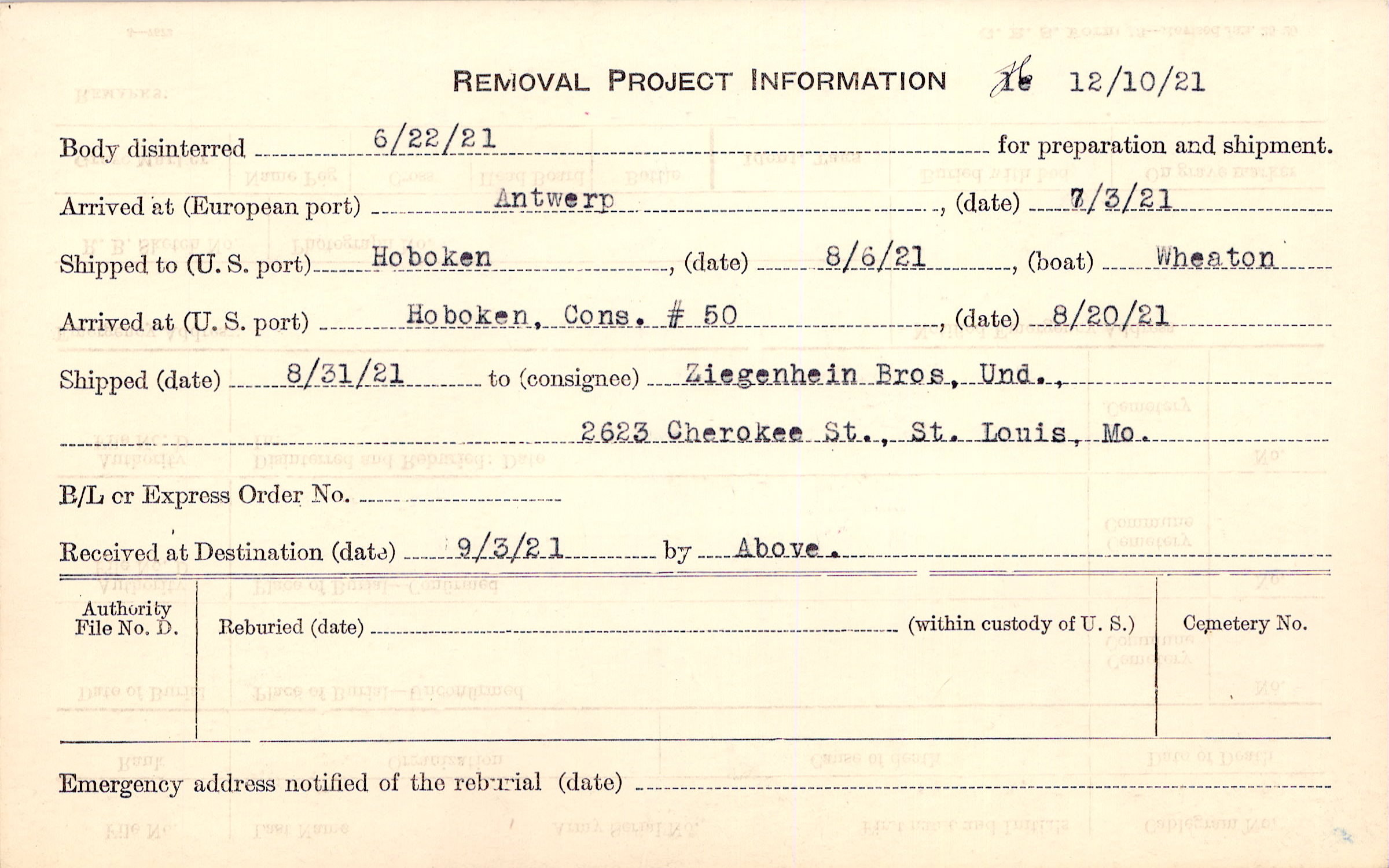 Body disinterred 6/22/1921 for preparation and shipment.