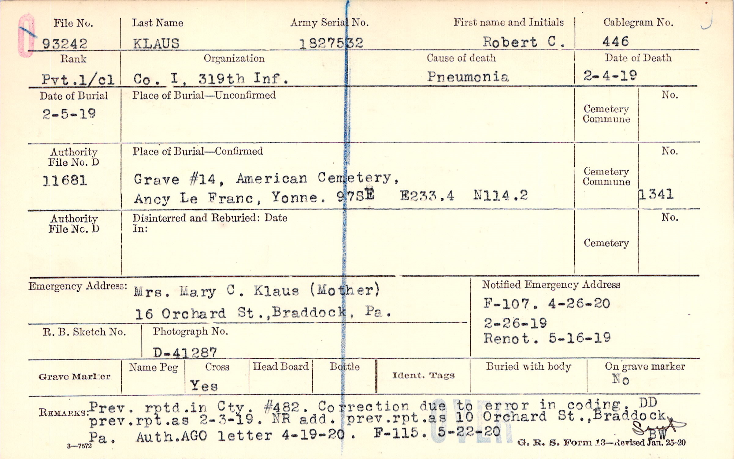 Mrs. Mary C. Klaus (Mother), 16 Orchard St., Braddock, Pa.