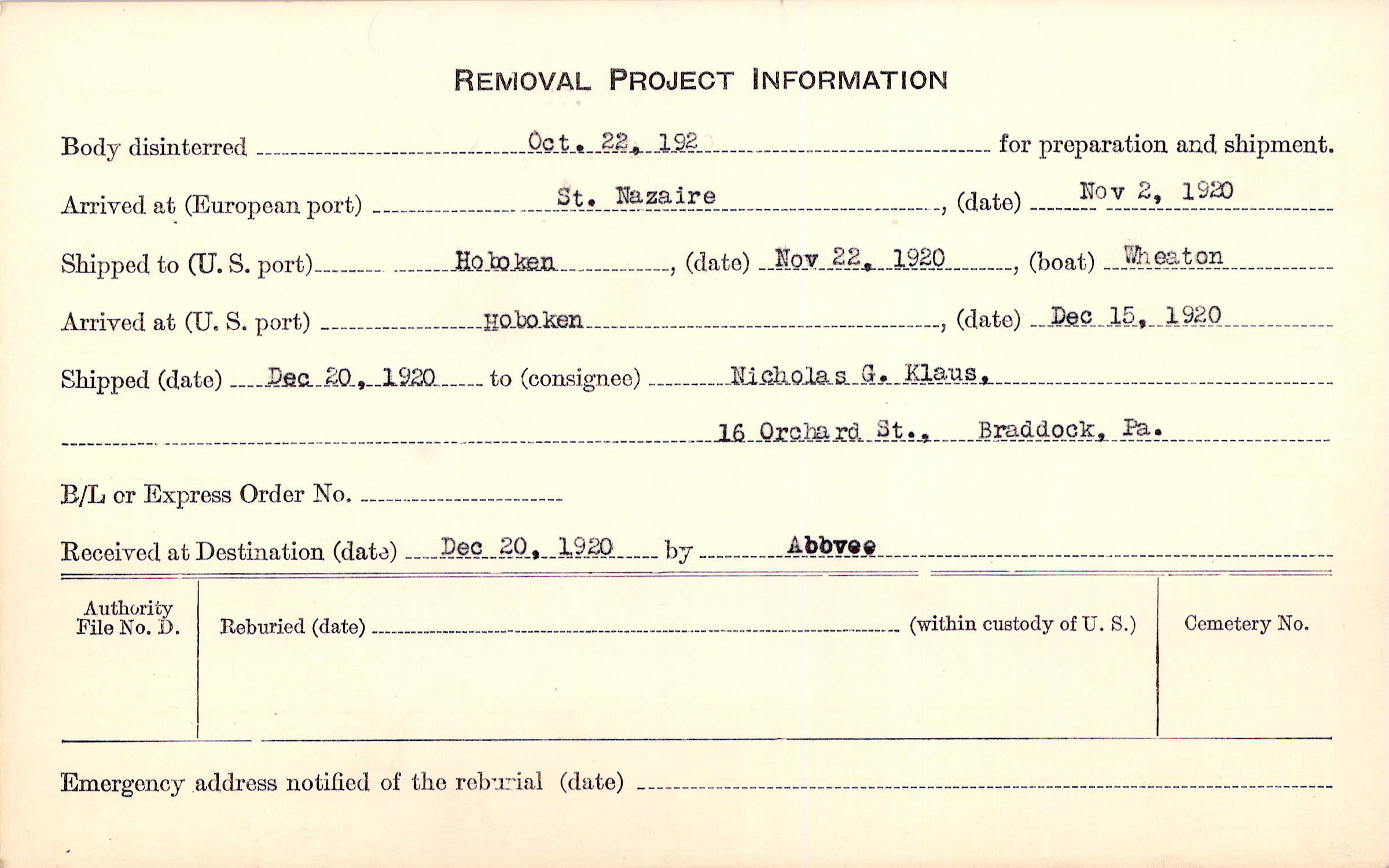 Body disinterred 10/22/1920 for preparation and shipment.