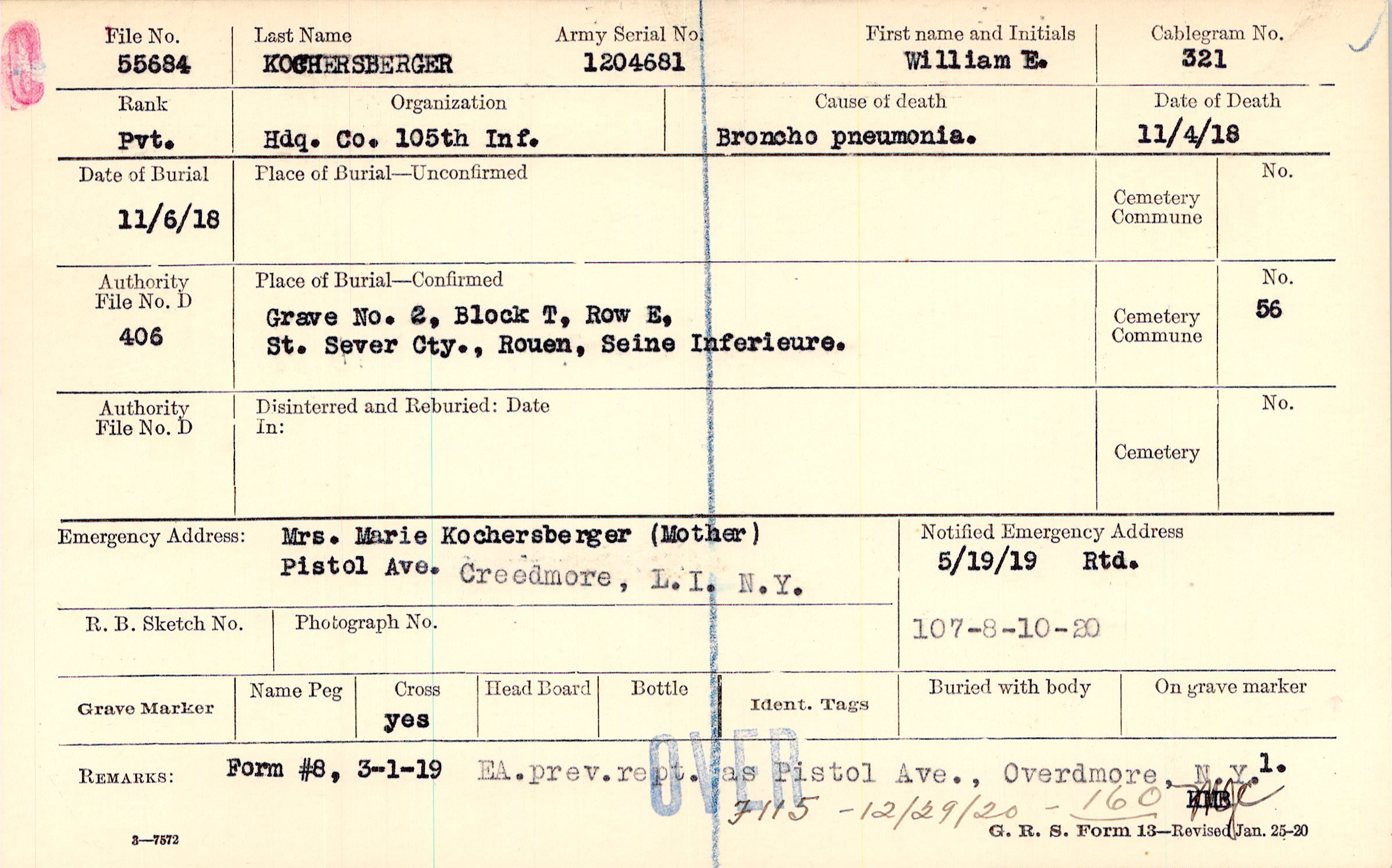 Mrs. Marie Kochersberger (Mother), Pistol Ave., Creedmore, L.I. N.Y.