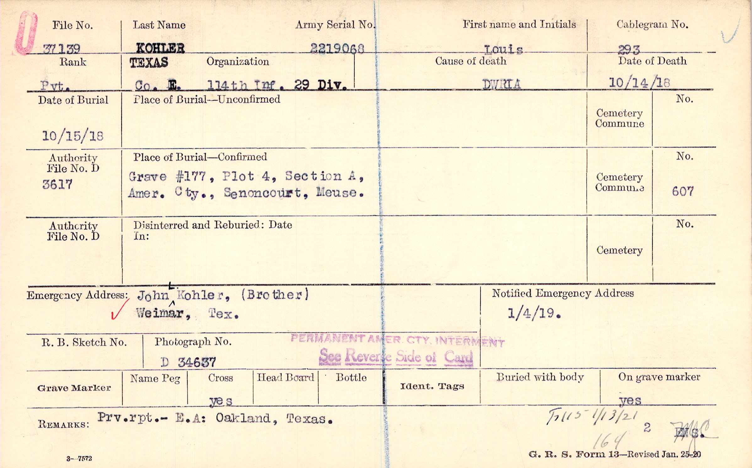 Prv. rpt., E.A.: Oakland, Texas., 1/13/1921