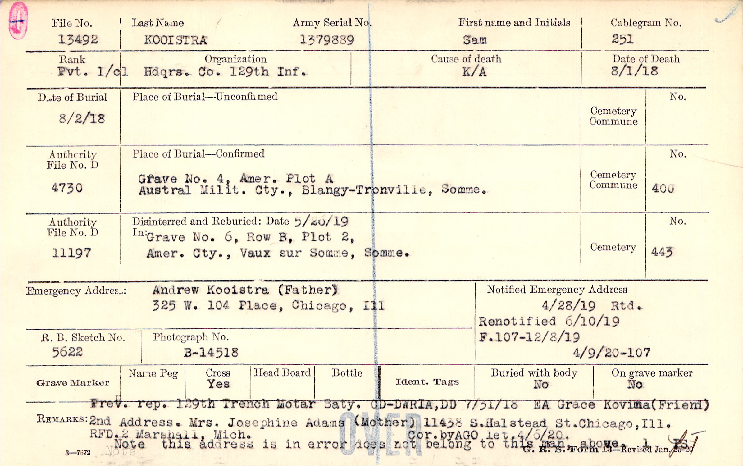 Prev. rep. 129th Trench Mortar Baty. CD-DWRIA, DD 7/31/18 EA Grace Kovima (Friend) 11438 S. Halstead St., Chicago, Ill. 2nd Address. Mrs. Josephine Adams (Mother) RFD. 2 Marshall, Mich. Cor. by AGO let. 4/6/20 Note this address is in error does not belilng to this man, above.