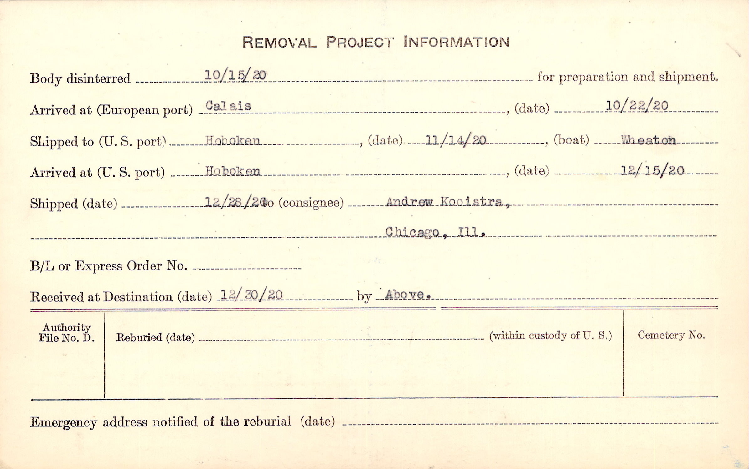 Body disinterred 10/15/1920 for preparation and shipment.