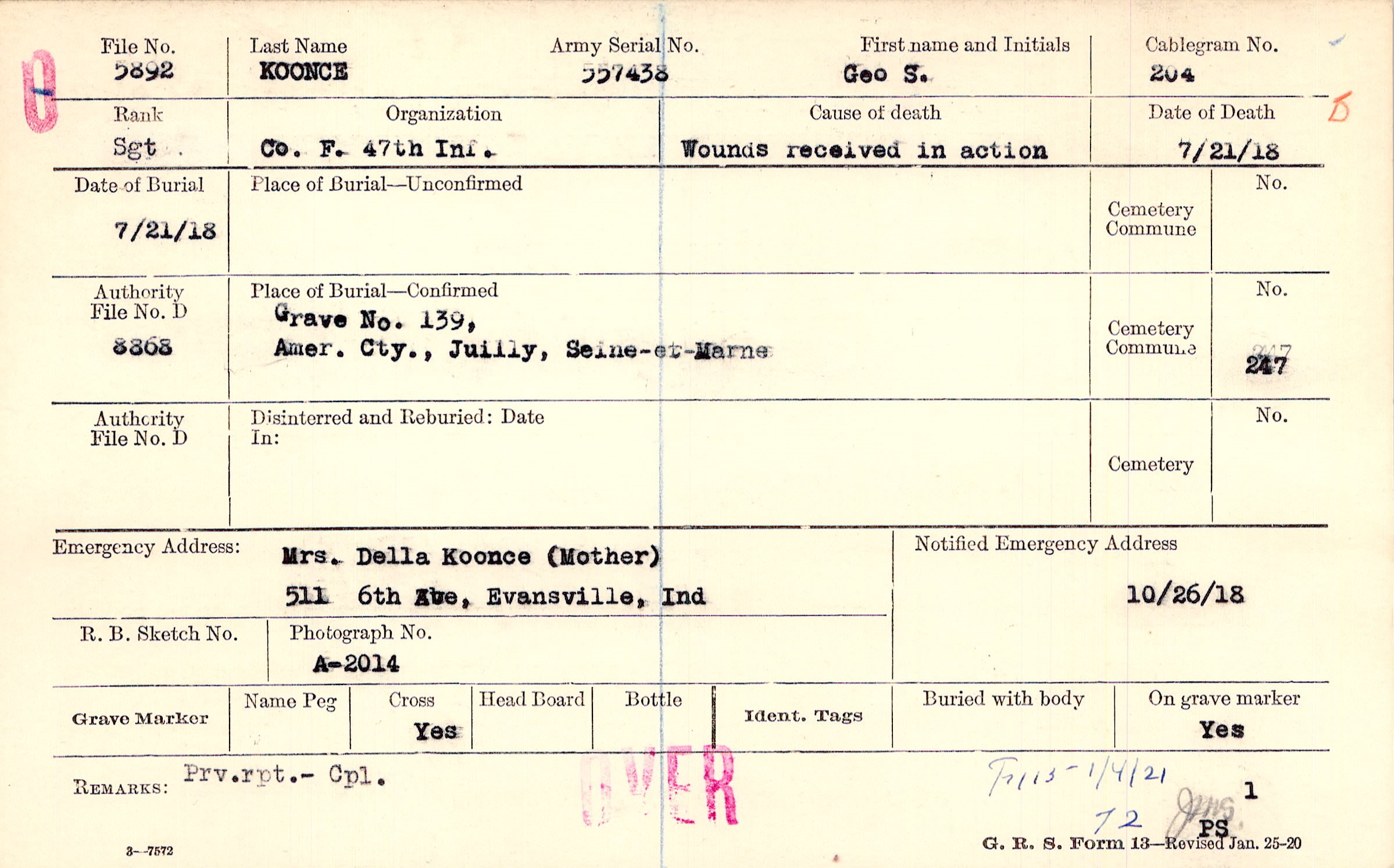Mrs. Della Koonce (Mother), 511 6th Ave., Evansville, Ind.