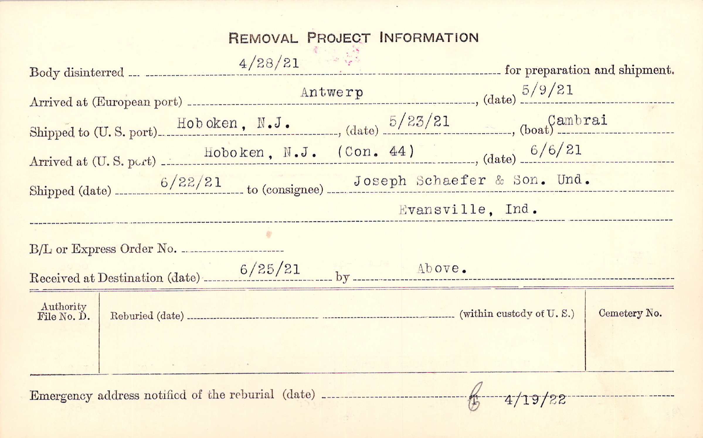 Body disinterred 4/28/1921 for preparation and shipment.