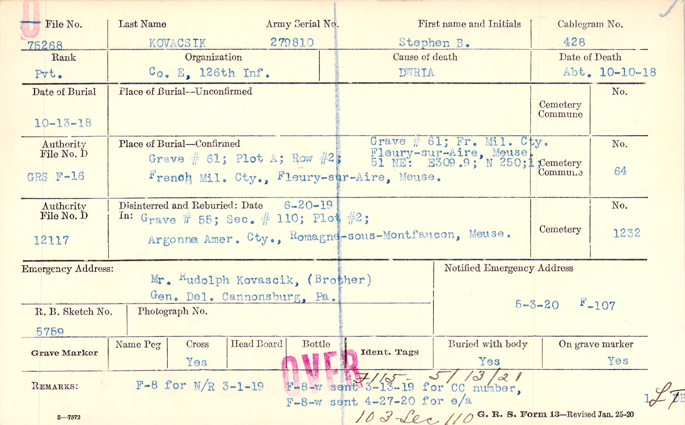 Mr. Rudolph Kovascik, (Brother), Gen. Del. Cannonsburg, Pa.