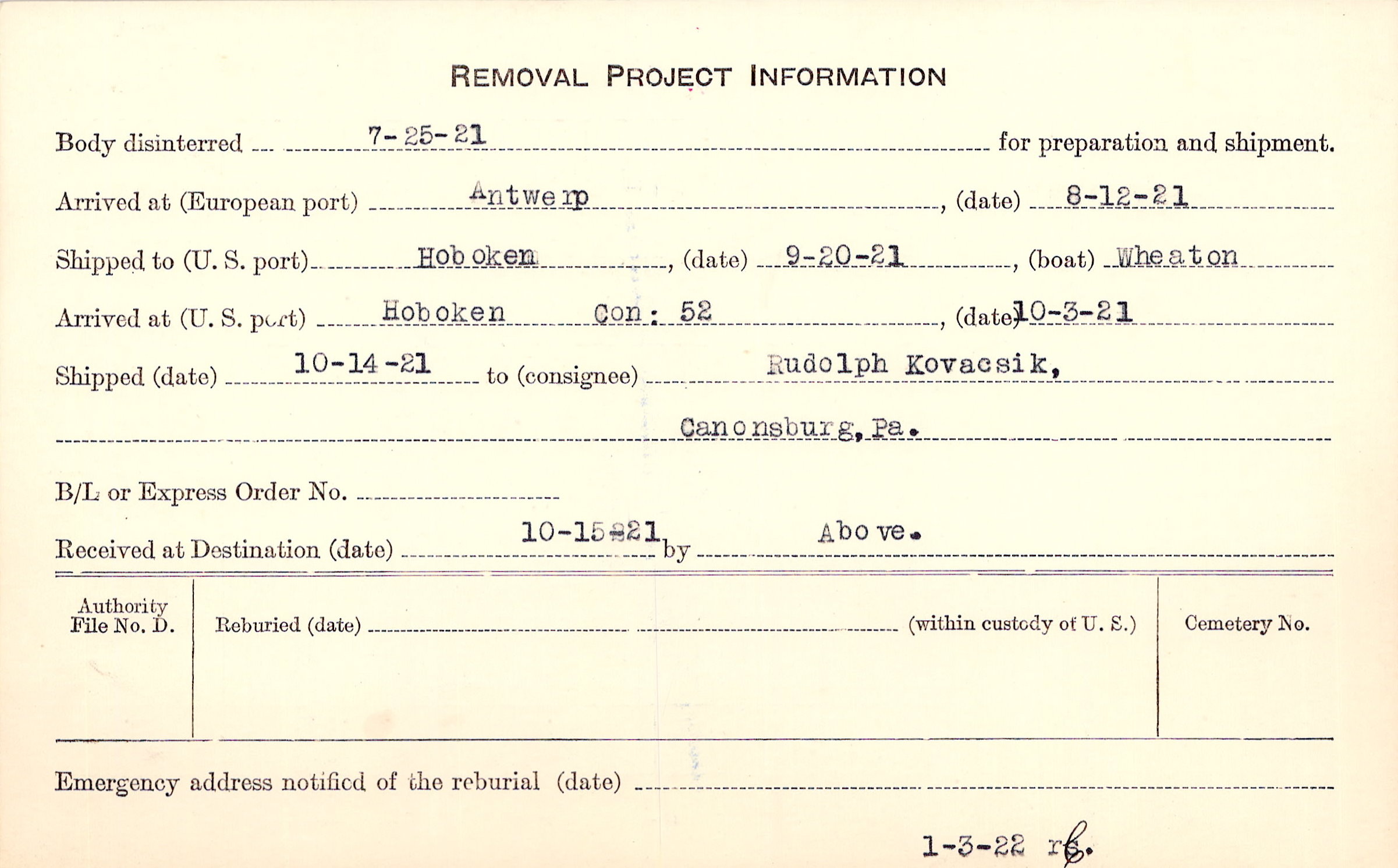 Body disinterred 7/25/1921 for preparation and shipment.