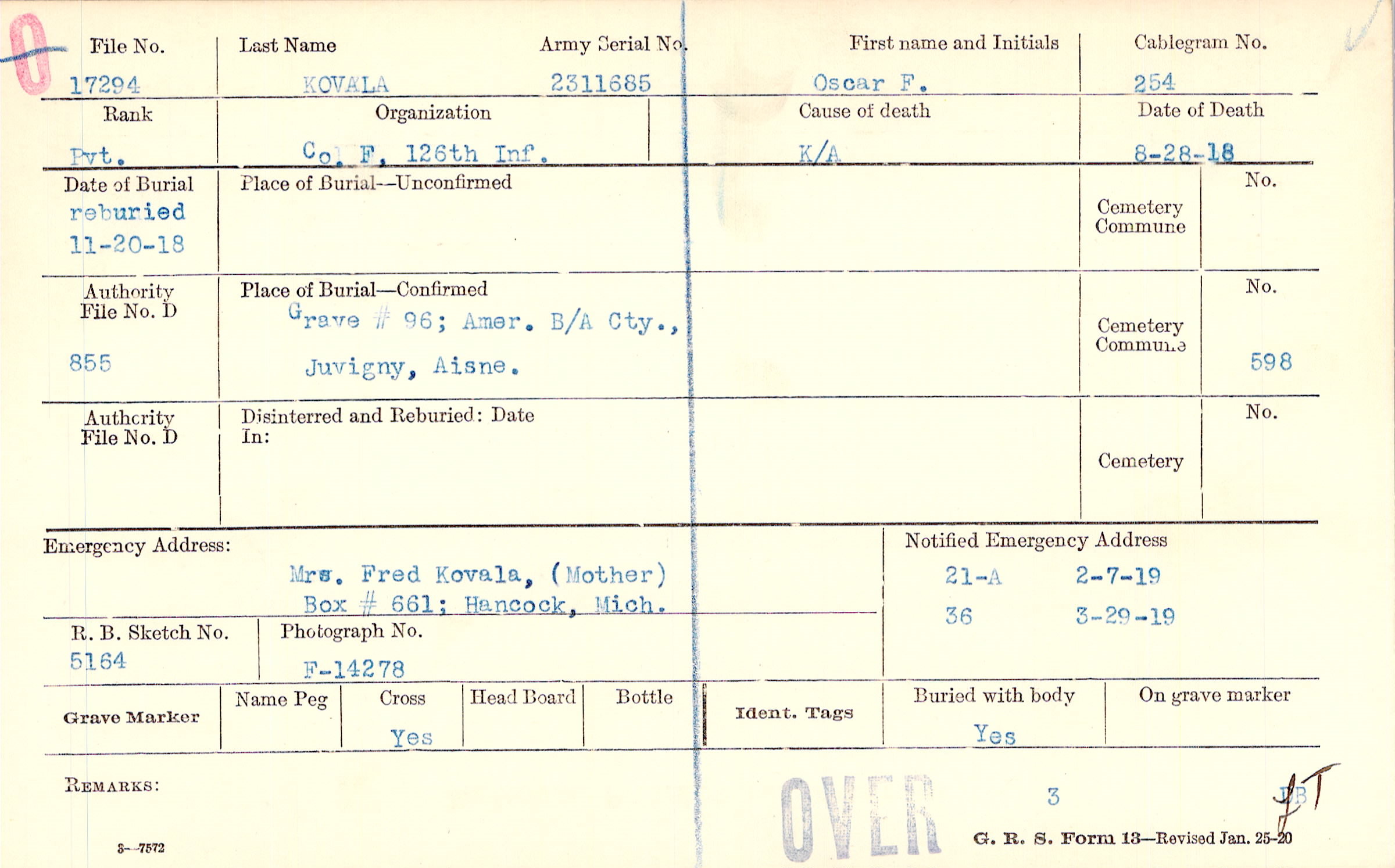 Mrs. Fred Kovala, (Mother), Box # 661; Hancock, Mich.