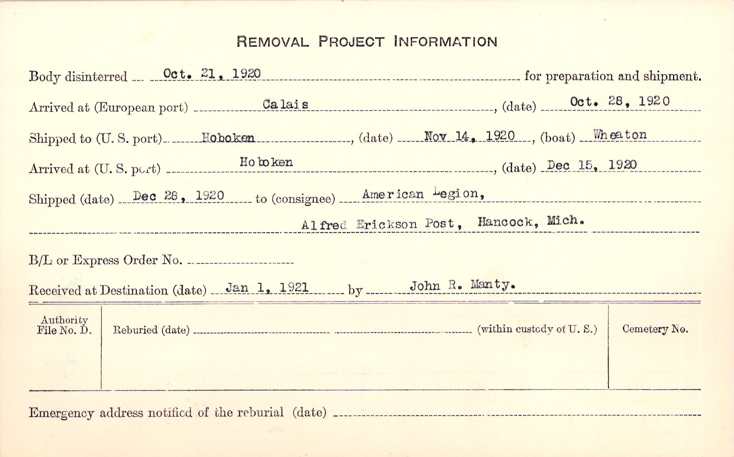 Body disinterred 10/21/1920 for preparation and shipment.