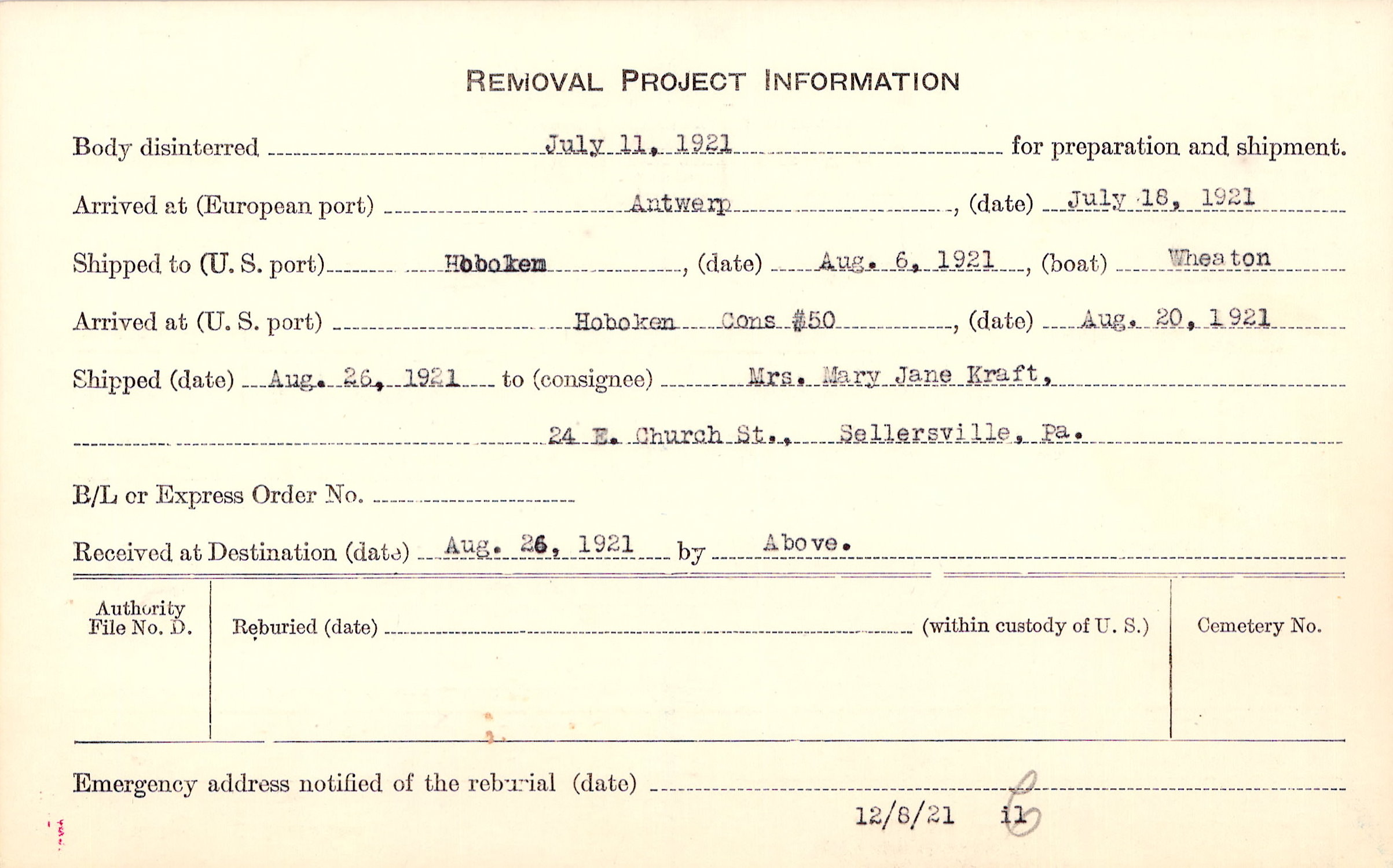 Body disinterred 7/11/1921 for preparation and shipment.