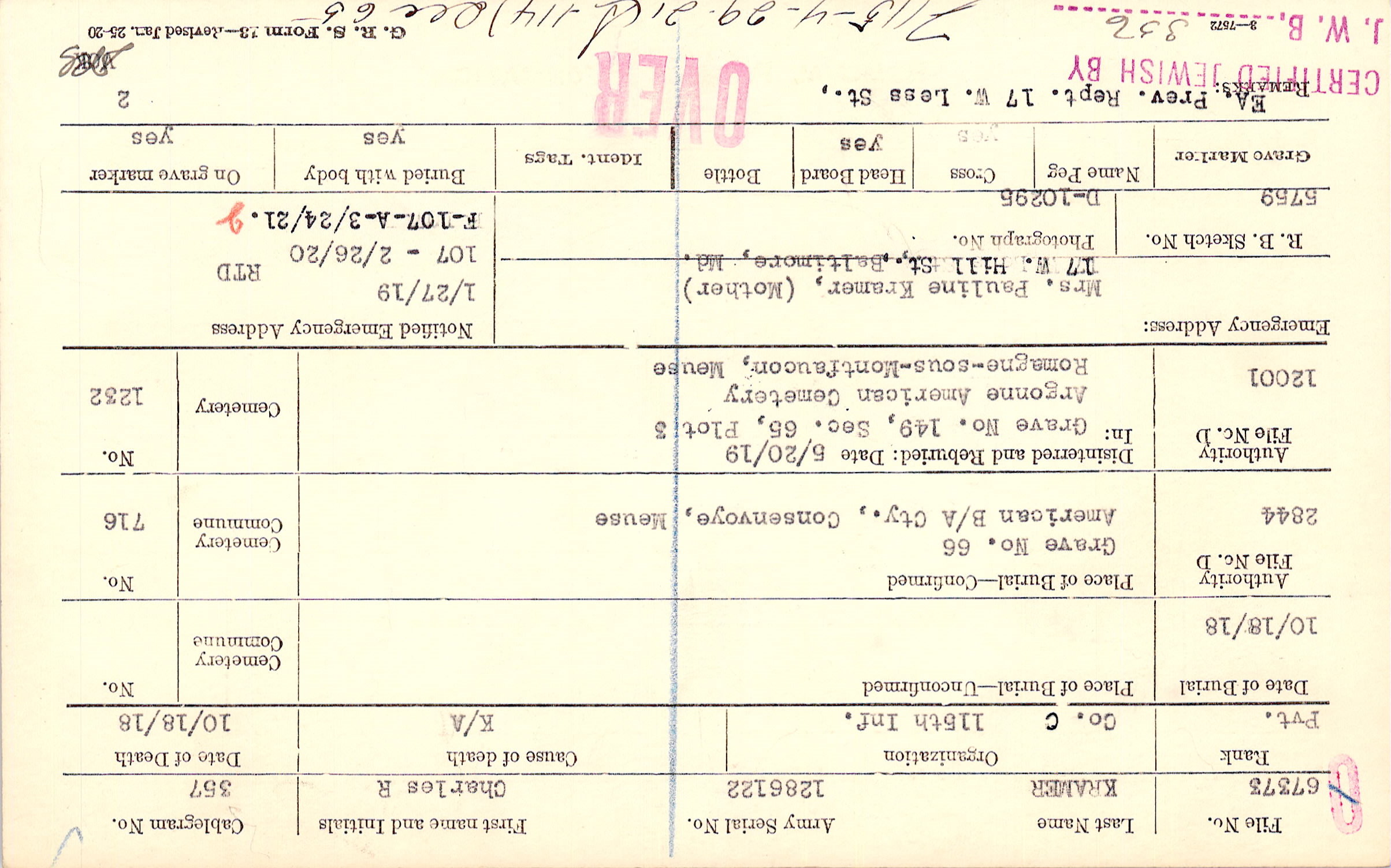 Mrs. Pauline Kramer, (Mother), 17 W. Hill St., Baltimore, Md.