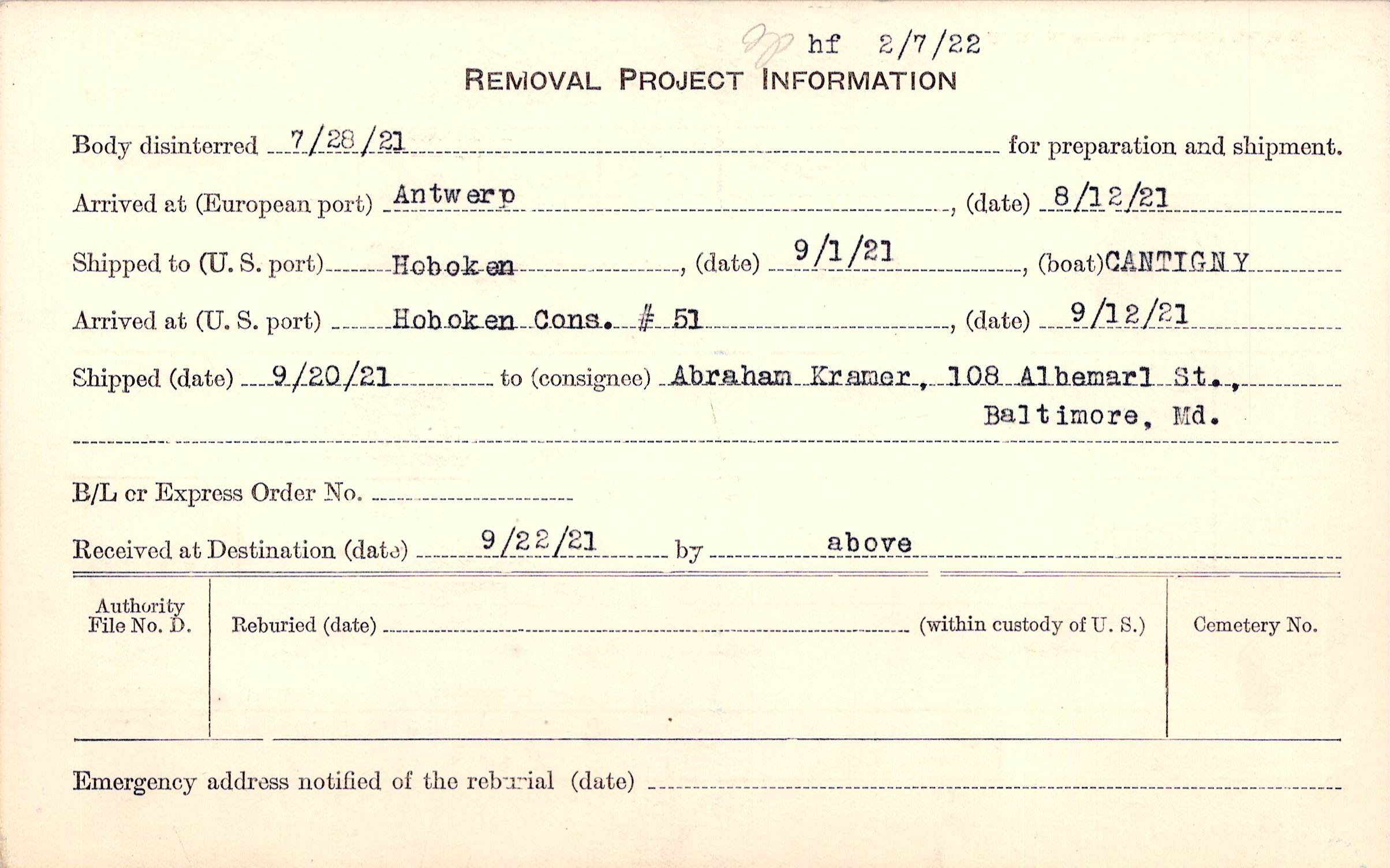 Body disinterred 7/28/1921 for preparation and shipment.