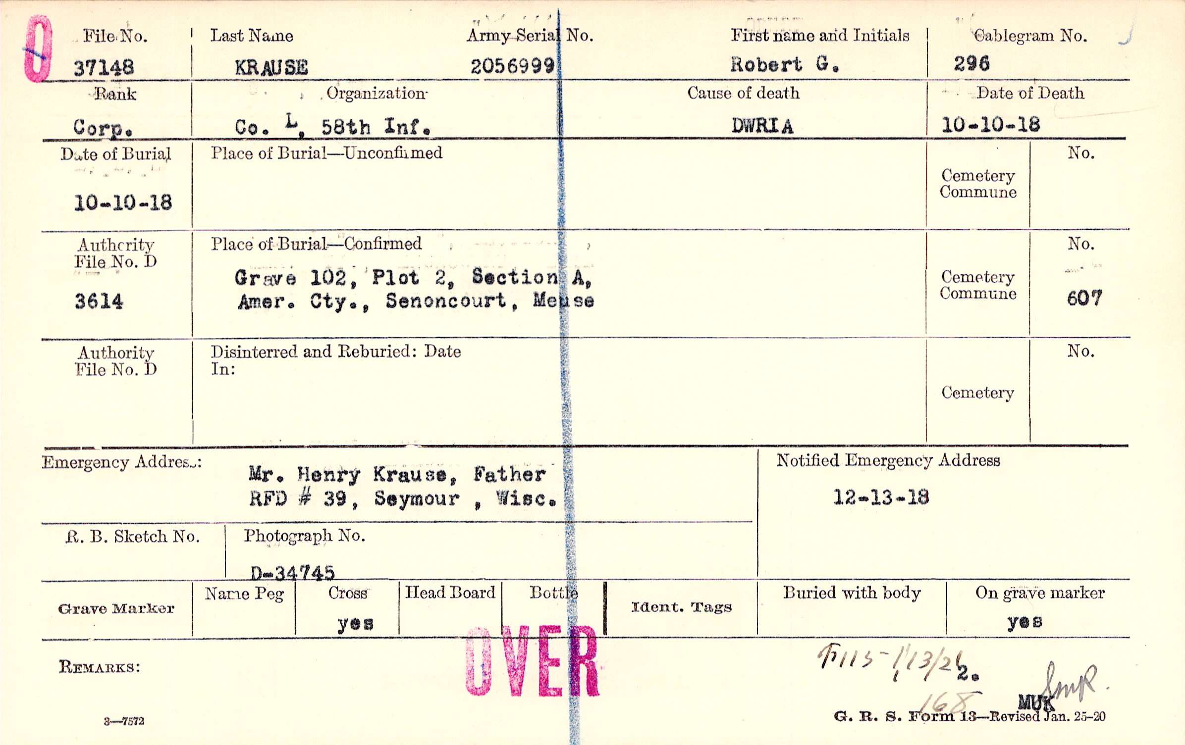 Grave 102, Plot 2, Section A, Amer. Cty., Senoncourt, Meuse.