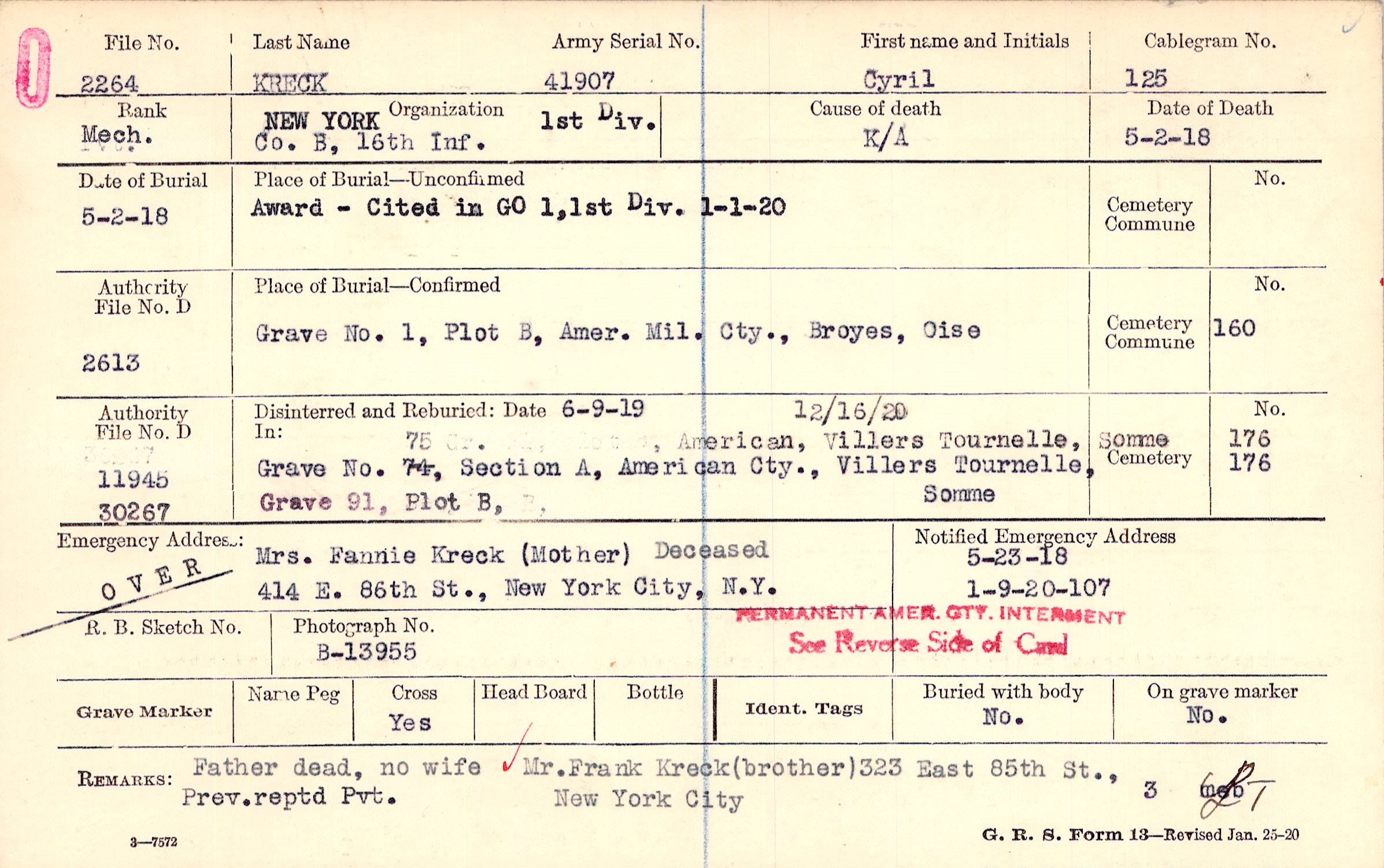 Father dead, no wife. Mr. Frank Kreck (brother), 323 East 85th St., New York City Prev. reptd Pvt.