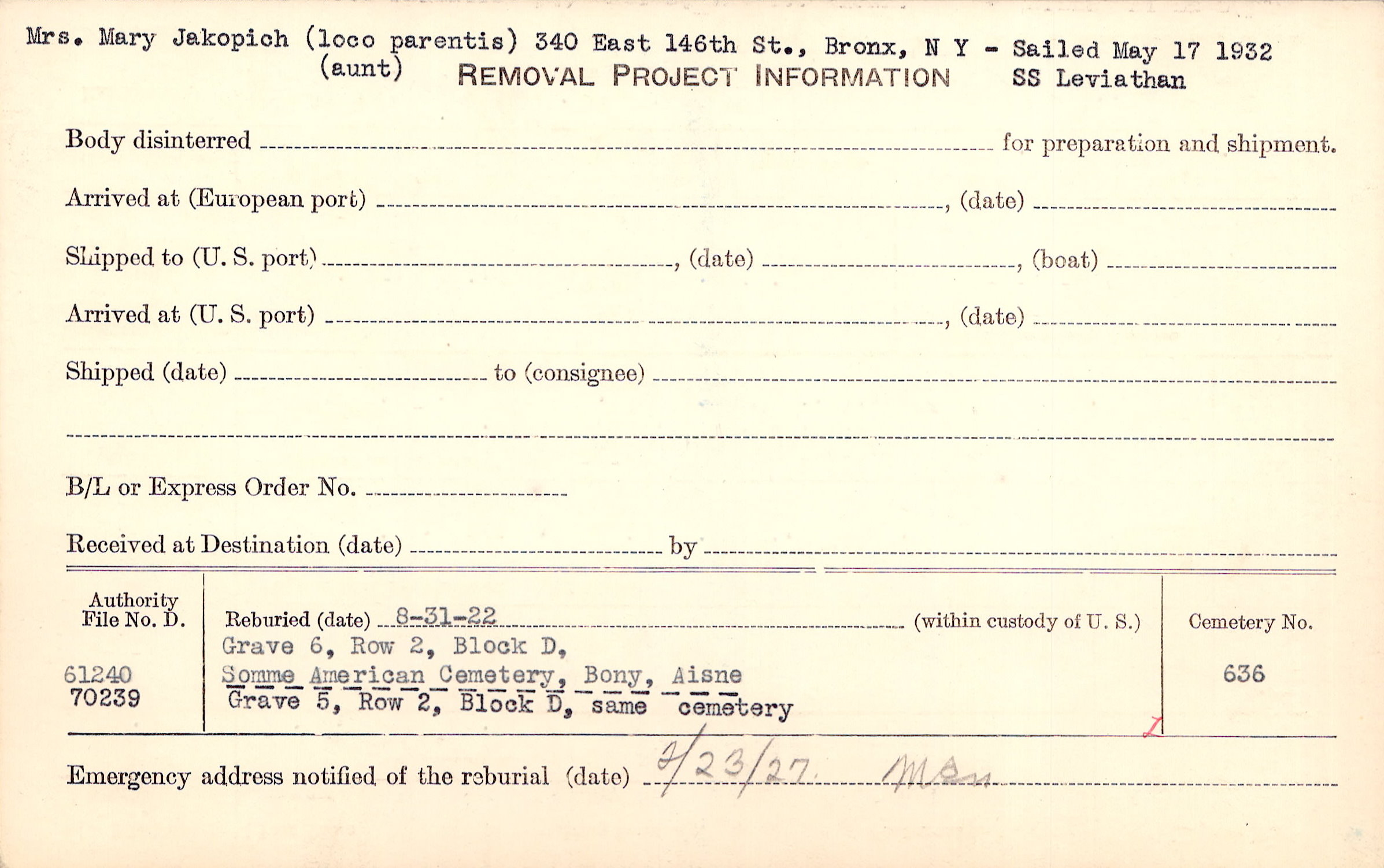 Mrs. Mary Jakopich (loco parentis) (aunt), 340 East 146th St., Bronx, N Y - Sailed May 17 1932 SS Leviathan |