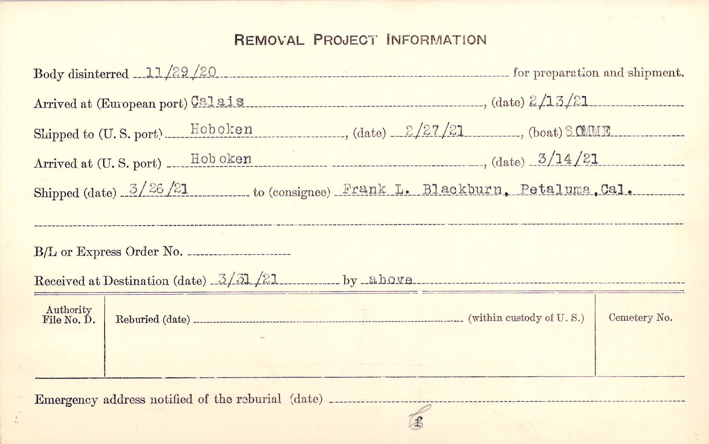 Body disinterred 11/29/1920 for preparation and shipment.
