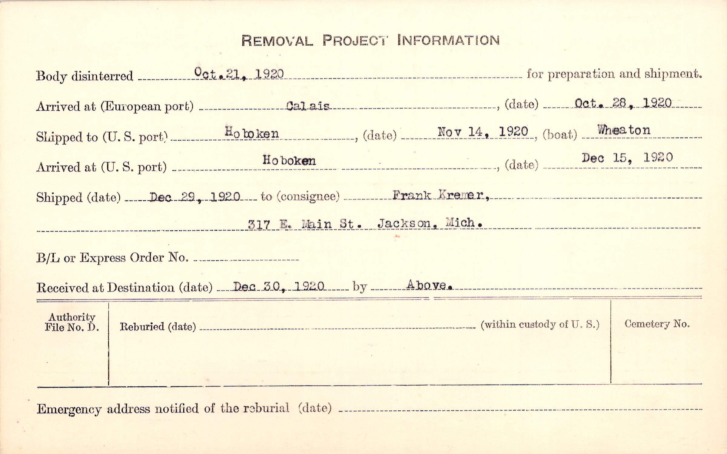 to Frank Kremer, 317 E. Main St., Jackson. Mich.