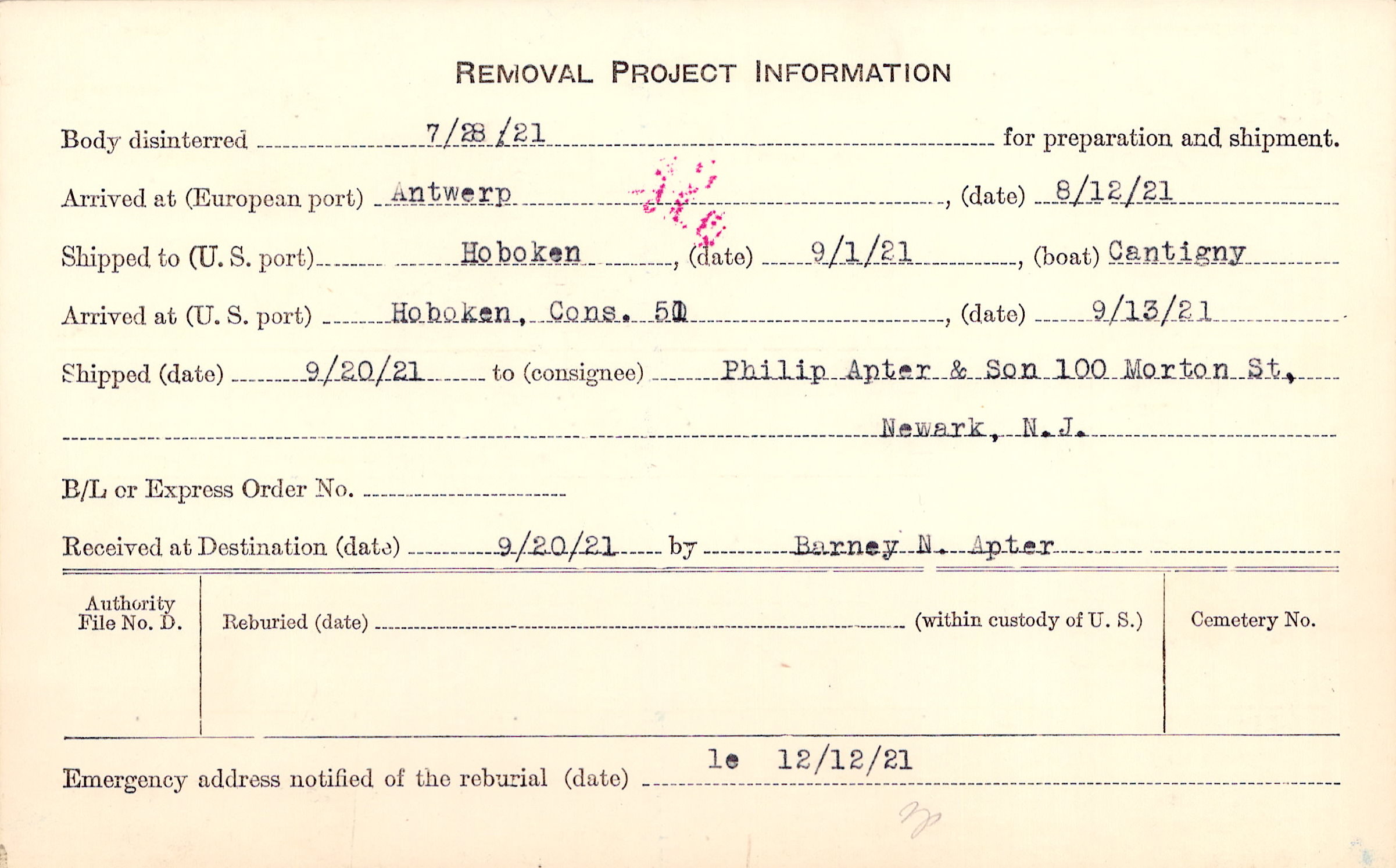 Body disinterred 7/28/1921 for preparation and shipment.