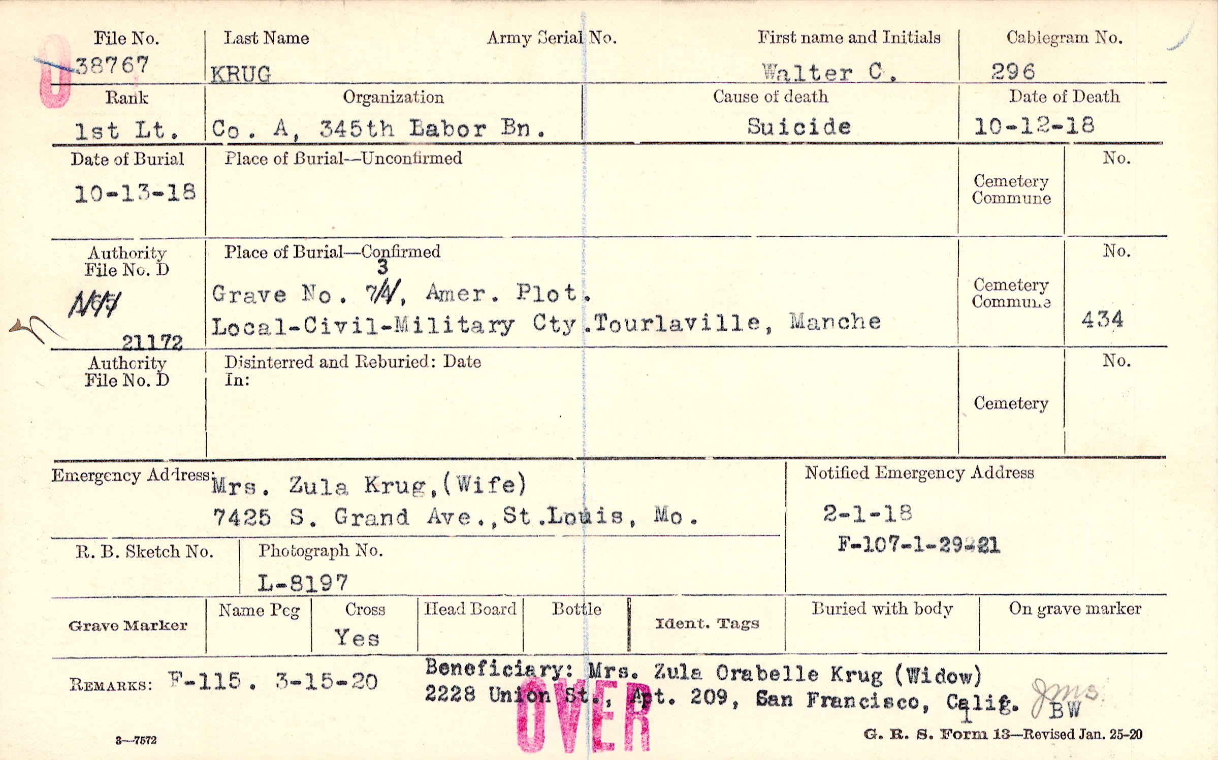 Mrs. Zula Krug, (Wife), 7425 S. Grand Ave., St. Louis, Mo.