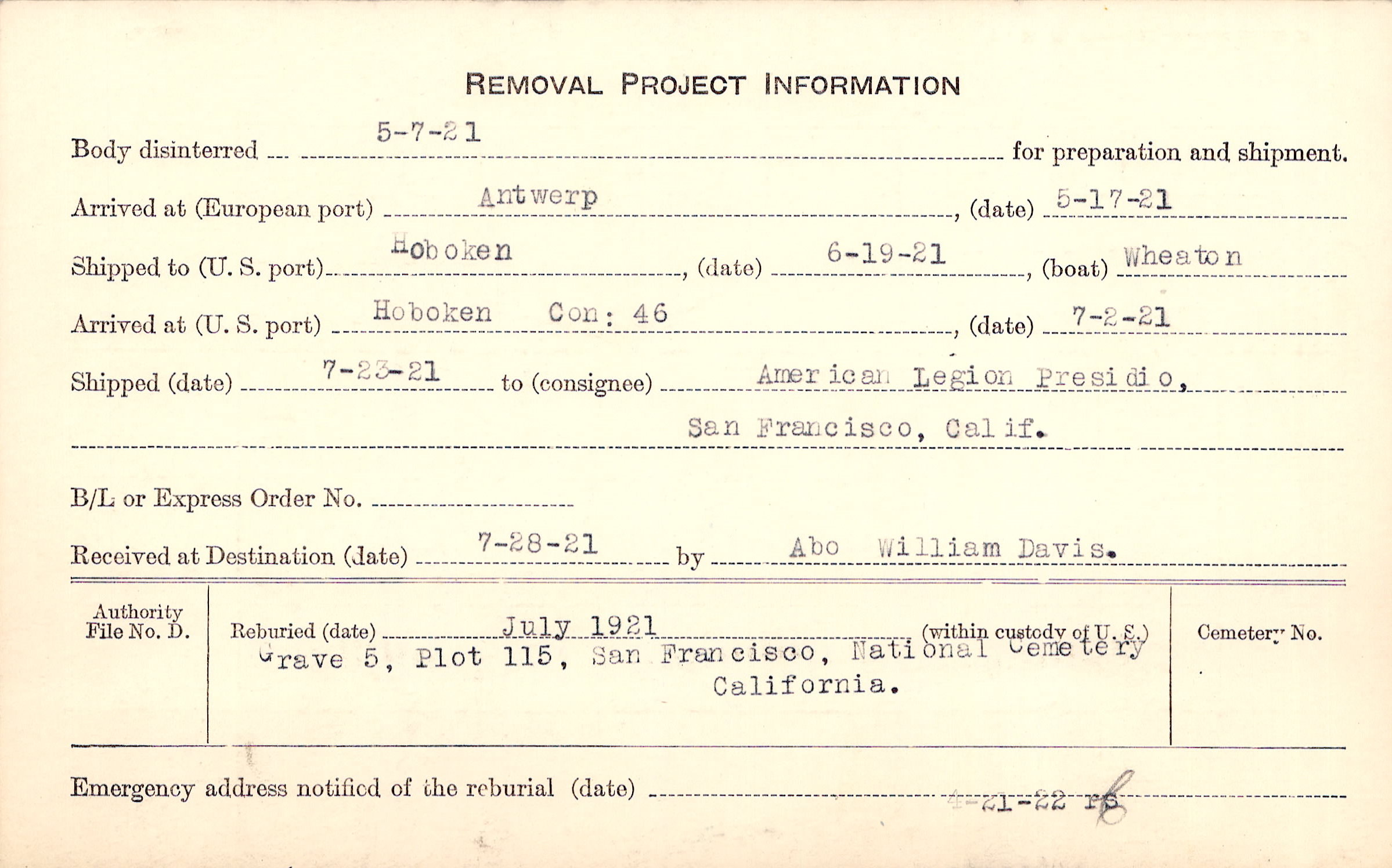 Body disinterred 5/7/1921 for preparation and shipment.
