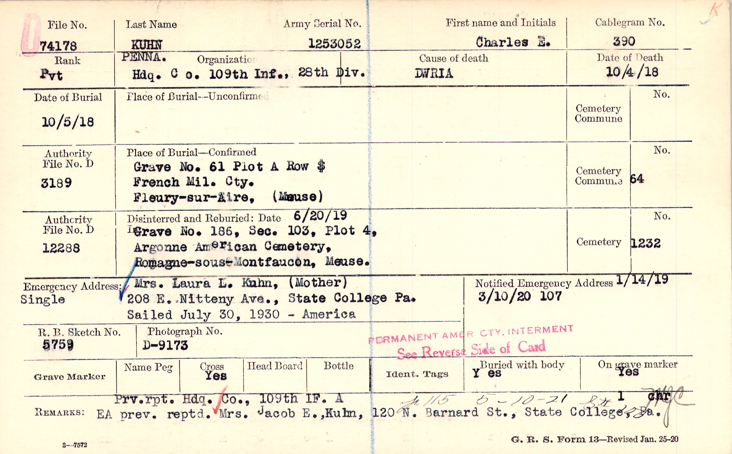 Prv. rpt. Hdq. Co., 109th IF. A EA prev. reptd. Mrs. Jacob E. Kuhn, 120 N. Barnard St., State College, Pa., F115 5-10-21