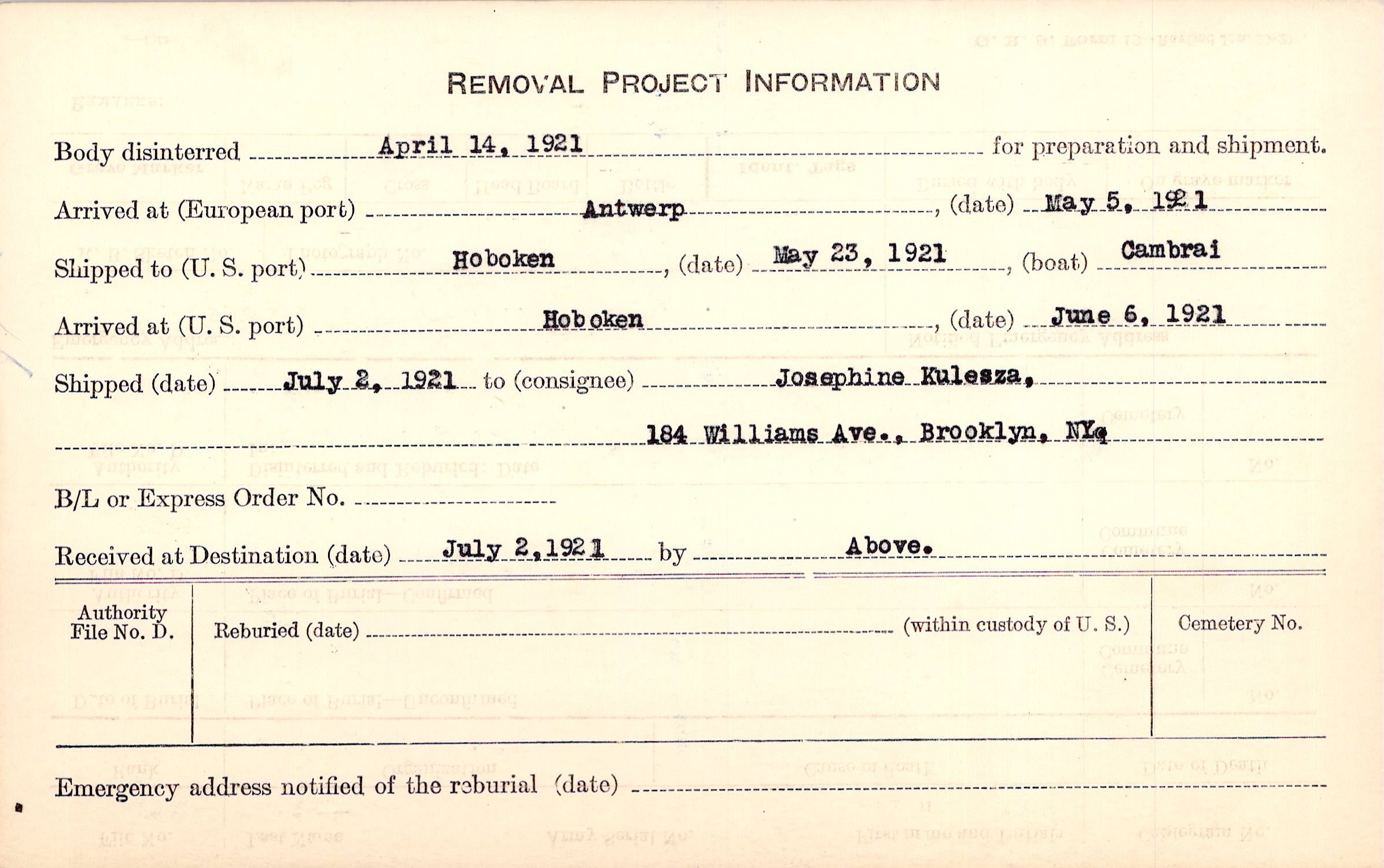 Body disinterred 4/14/1921 for preparation and shipment.