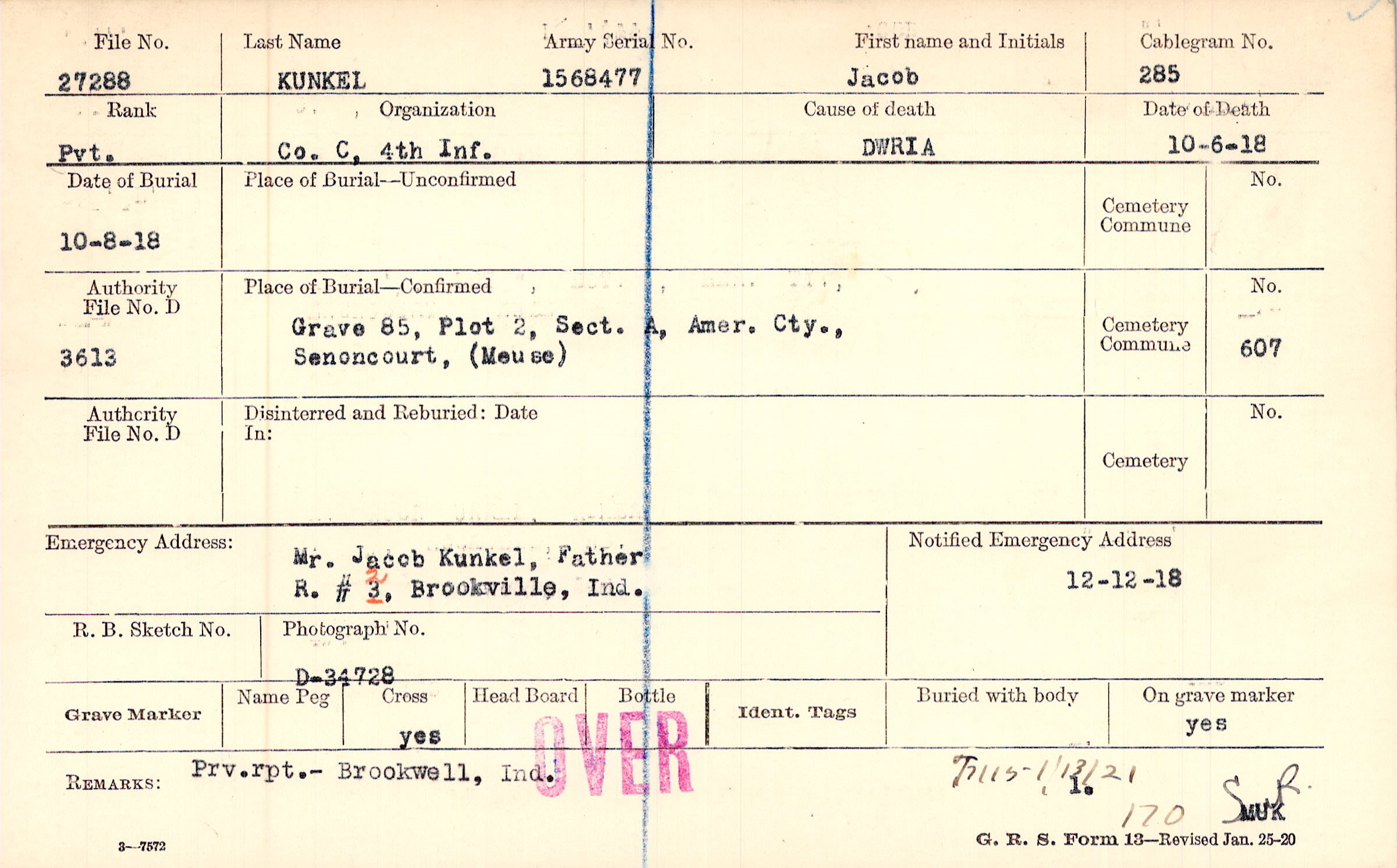 Mr. Jacob Kunkel, Father, R. # 2, Brookville, Ind.