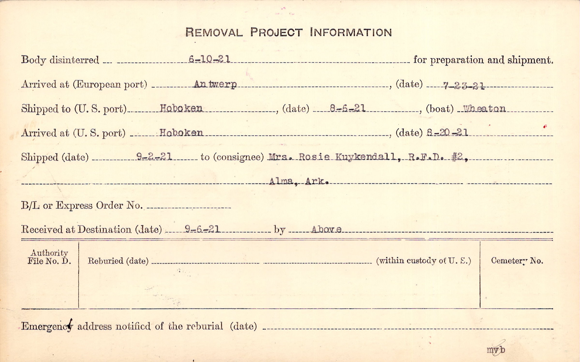 Body disinterred 6/10/1921 for preparation and shipment.