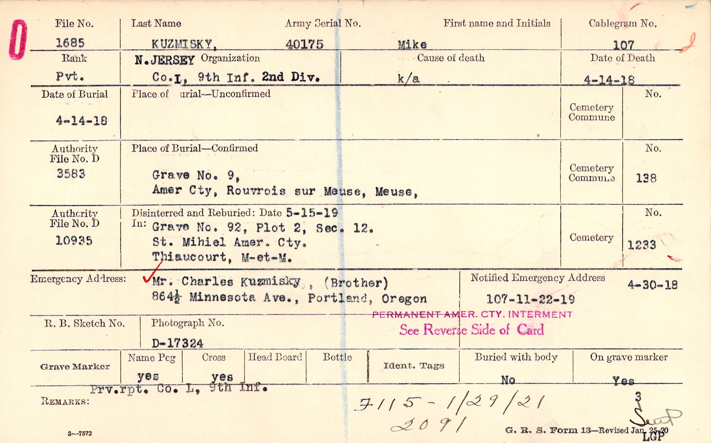 Mr. Charles Kuzmisky, (Brother), 864 1/2 Minnesota Ave., Portland, Oregon
