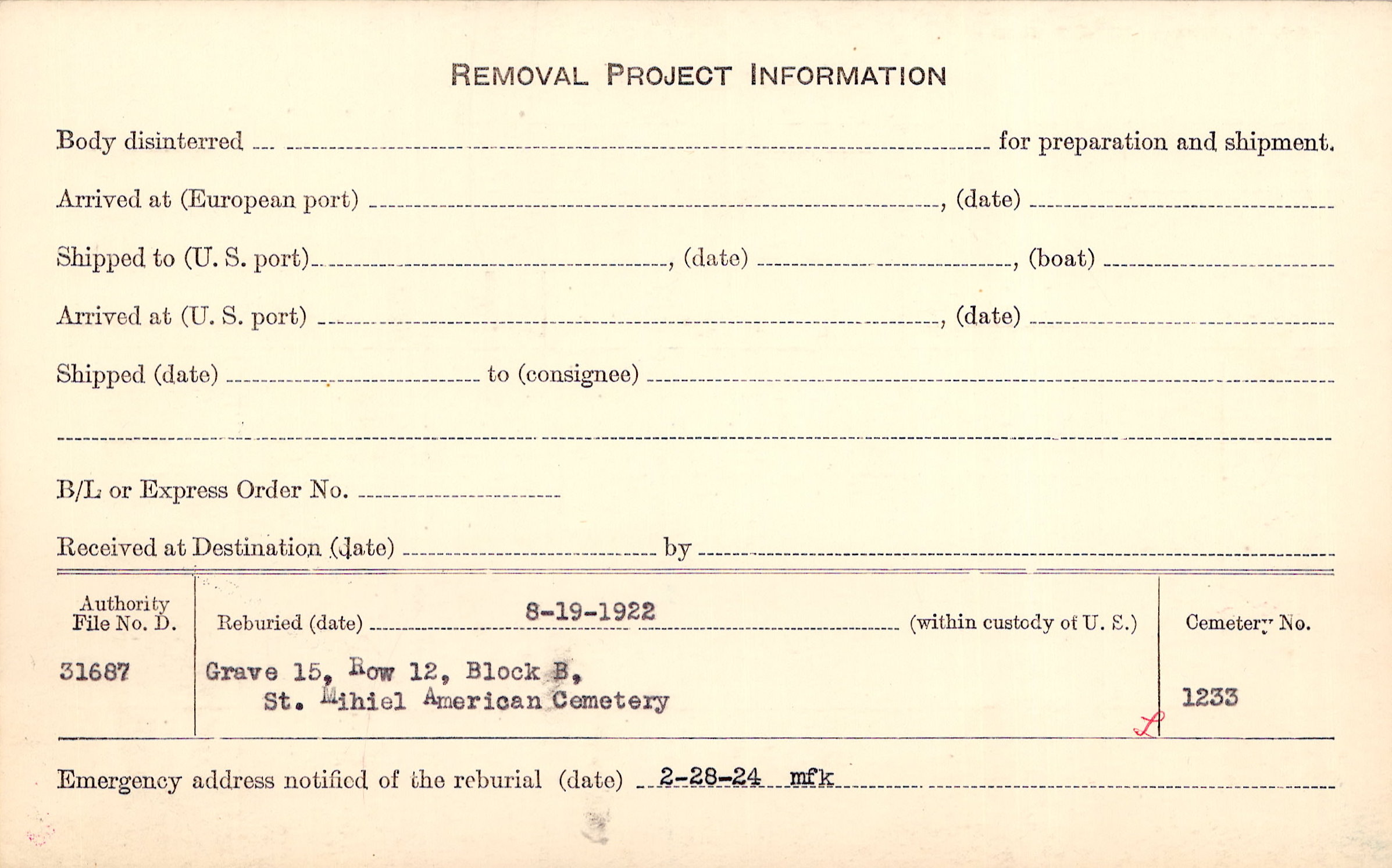 | Permanent Burial in Foreign Cemetery |