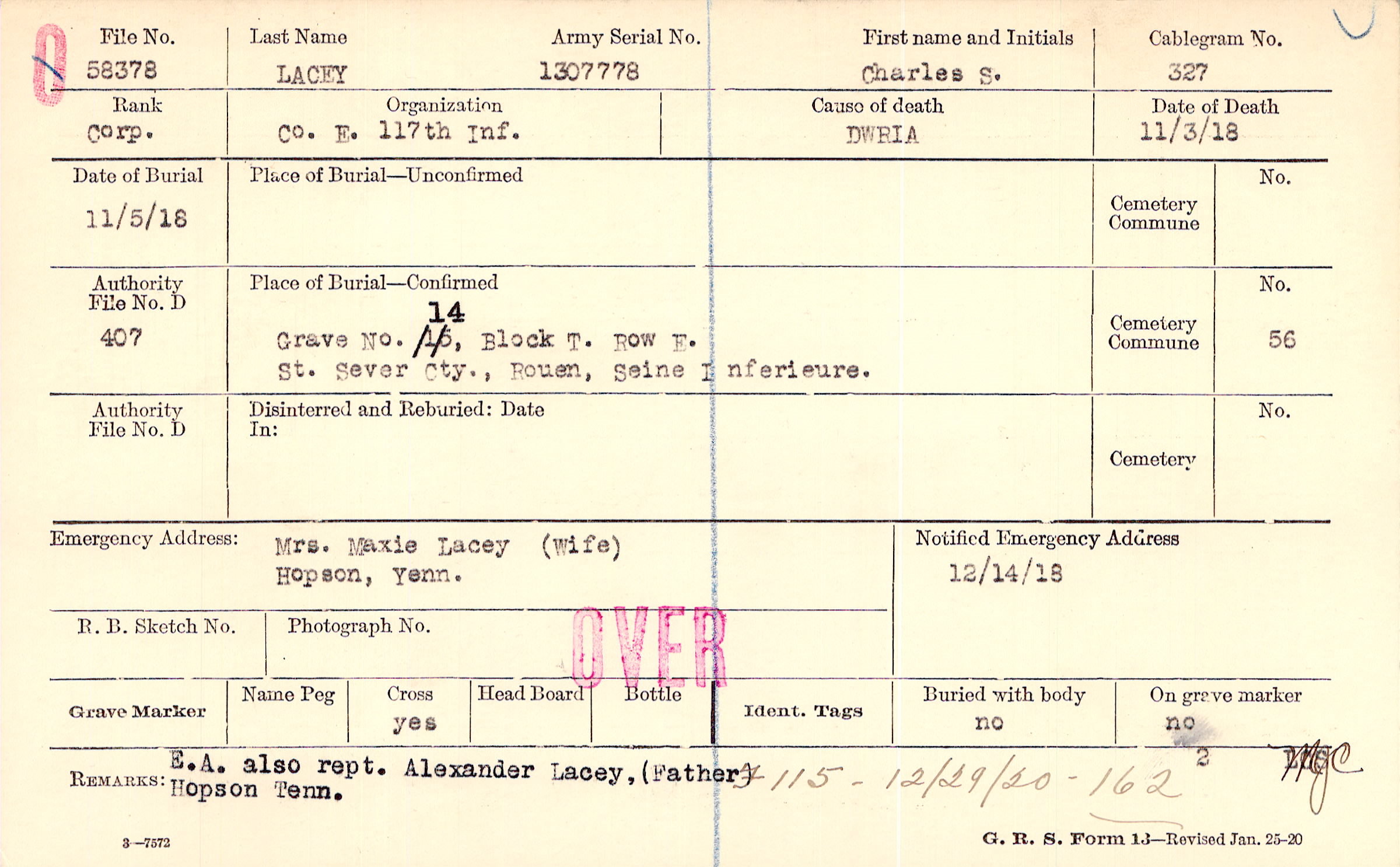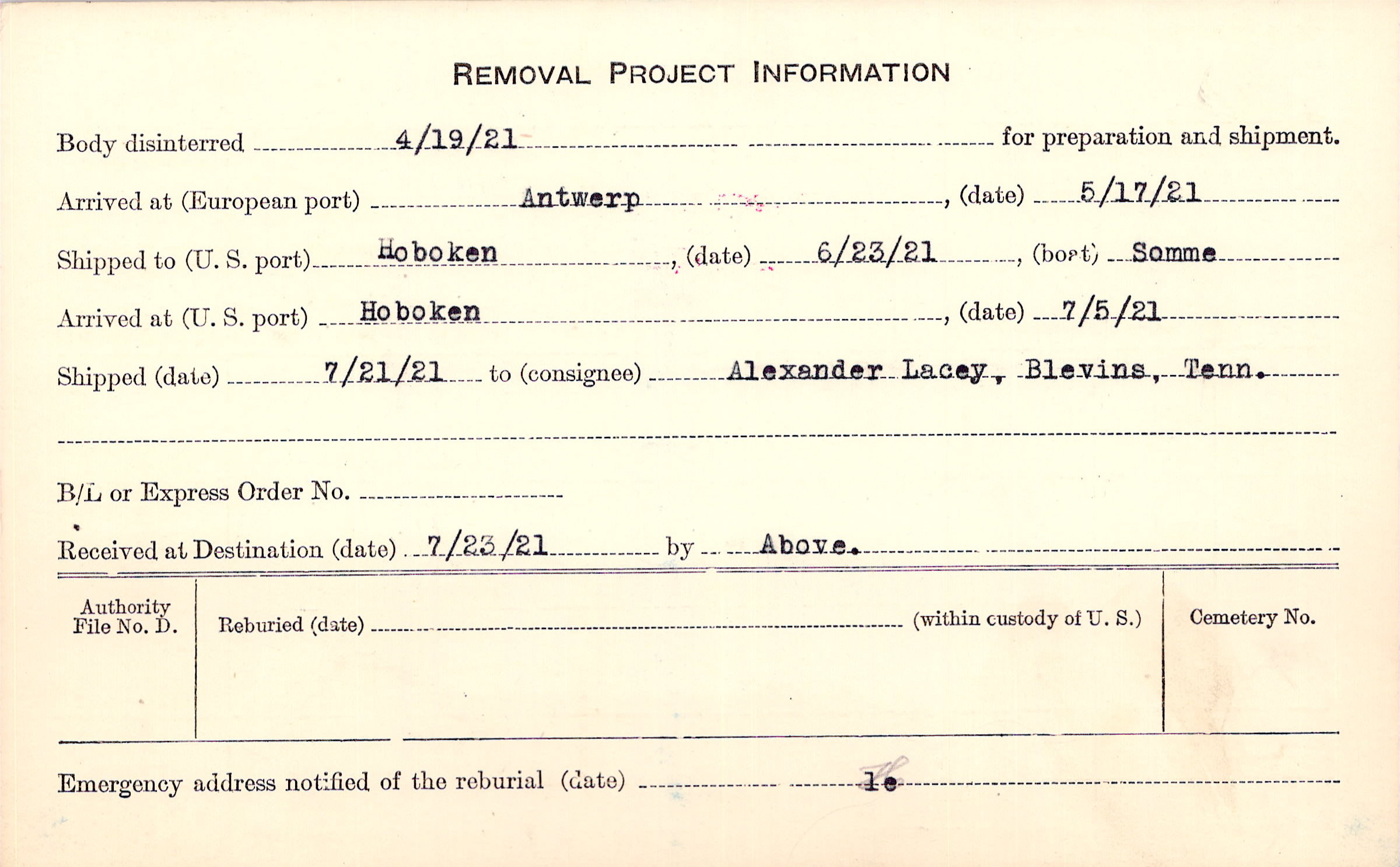 E.A. also rept. Alexander Lacey, (Father) Hopson, Tenn.
