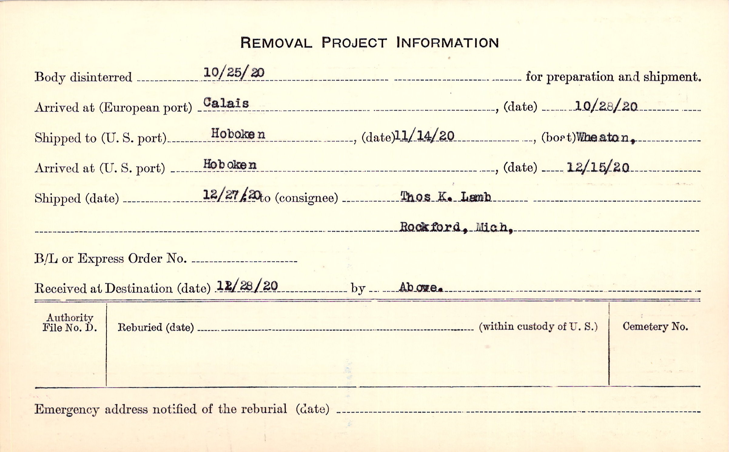 Body disinterred 10/25/1920 for preparation and shipment.