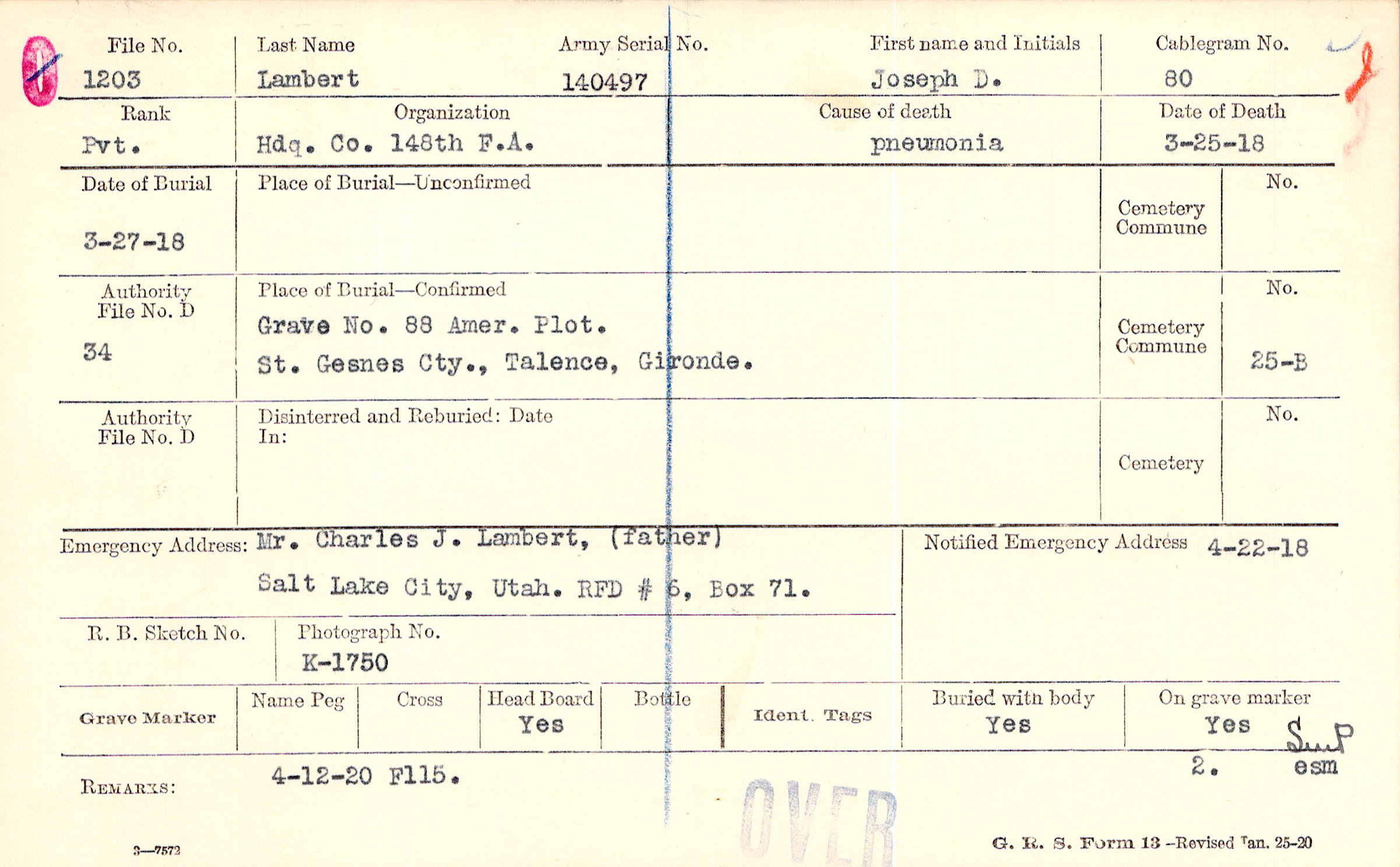 Mr. Charles J. Lambert, (father), Salt Lake City, Utah. RFD # 6, Box 71.