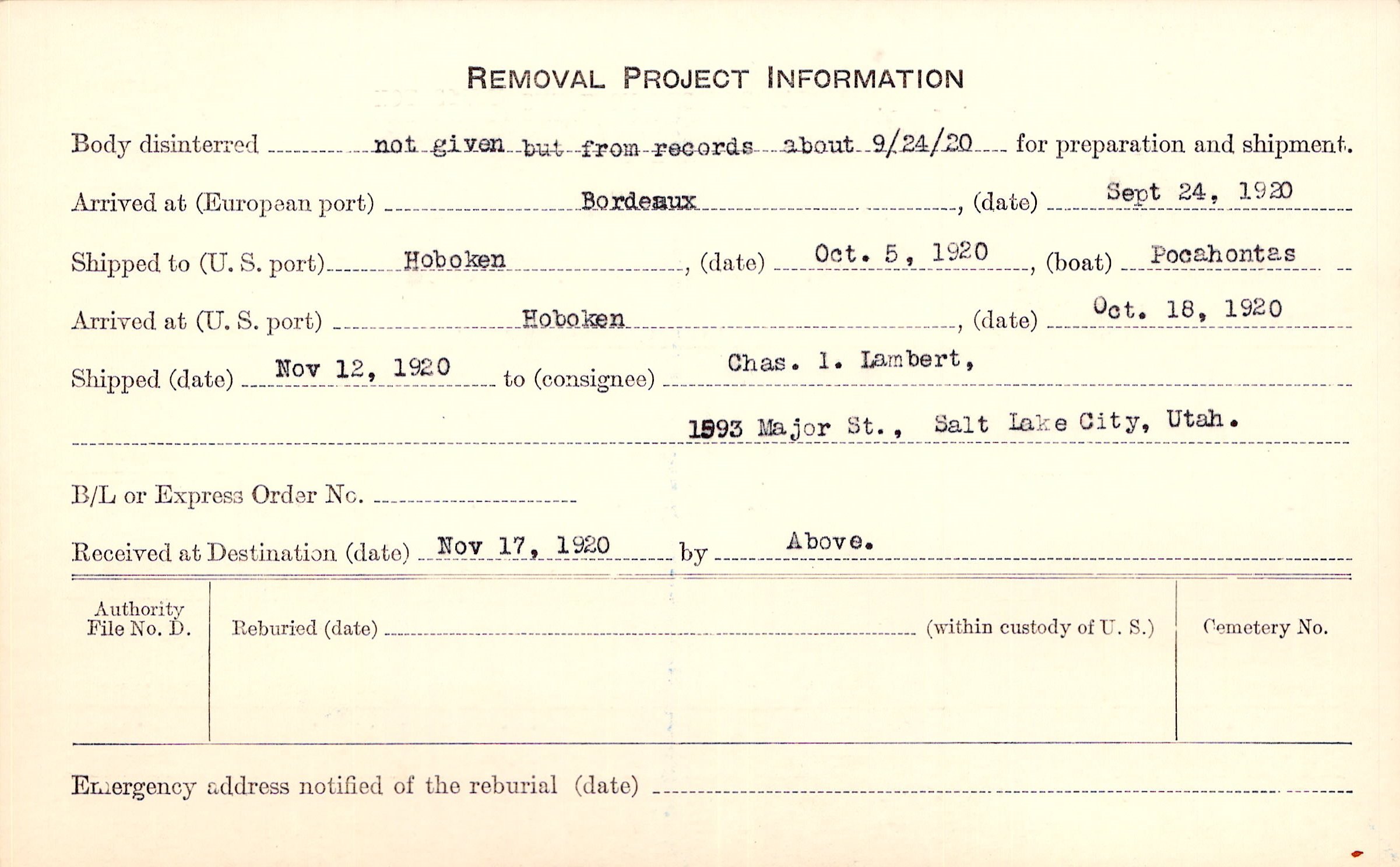 Body disinterred 9/24/1920 for preparation and shipment.