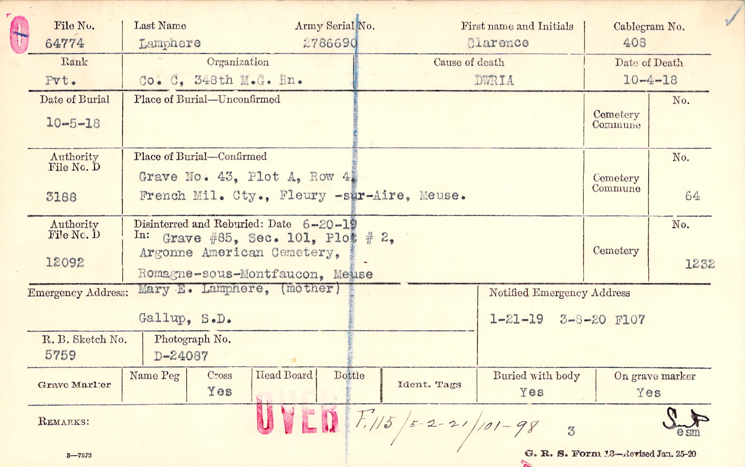 Grave 85, Section 101, Plot 2, Argonne American Cemetery, Romagne-sous-Montfaucon, Meuse