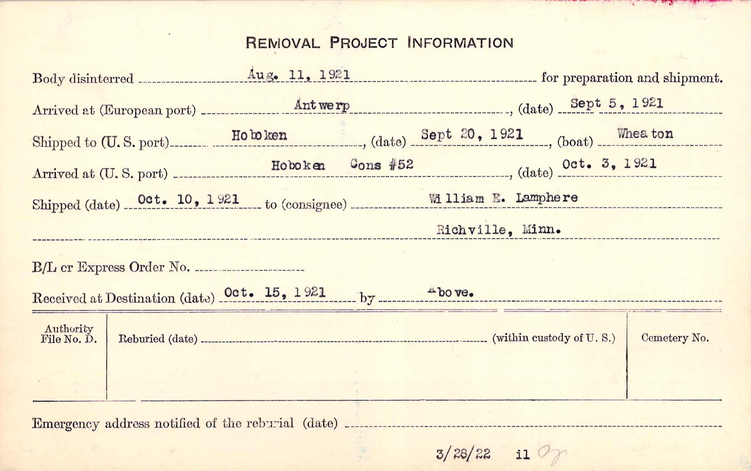 Body disinterred 8/11/1921 for preparation and shipment.