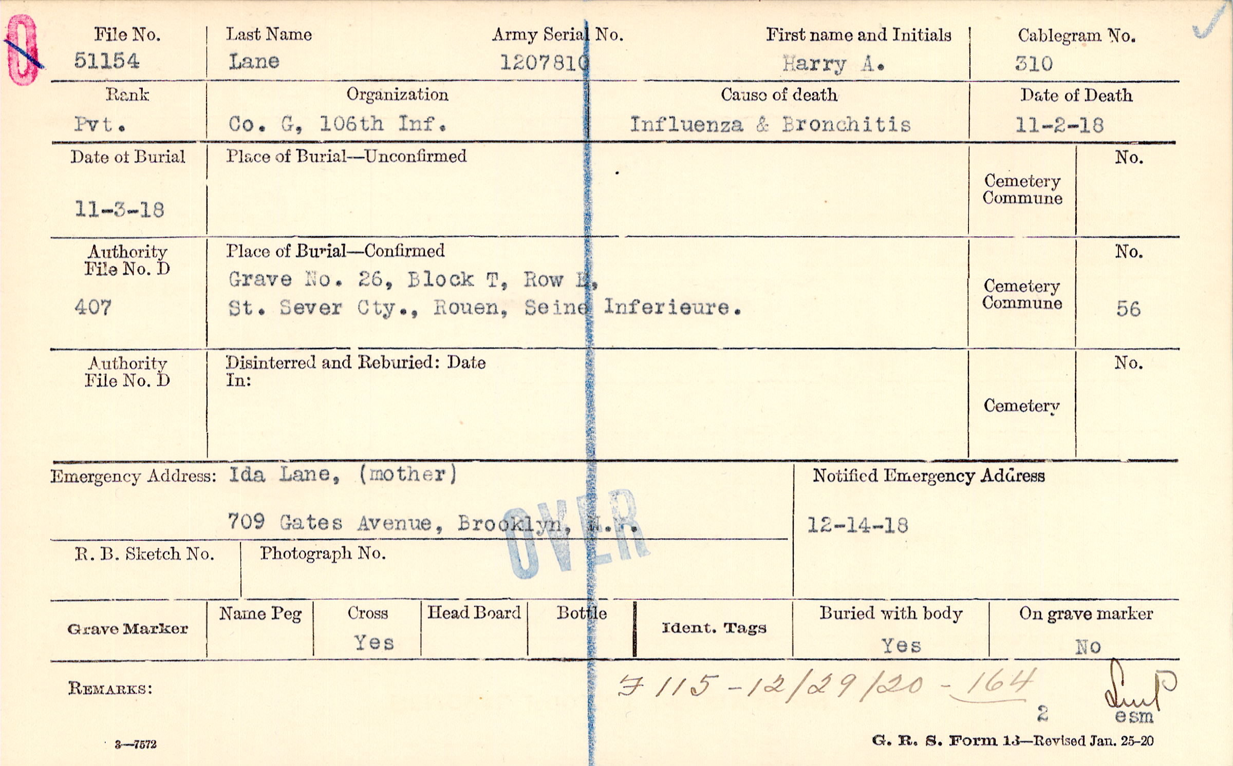 Grave 26, Block T, Row E, St. Sever Cty., Rouen, Seine Inferieure.