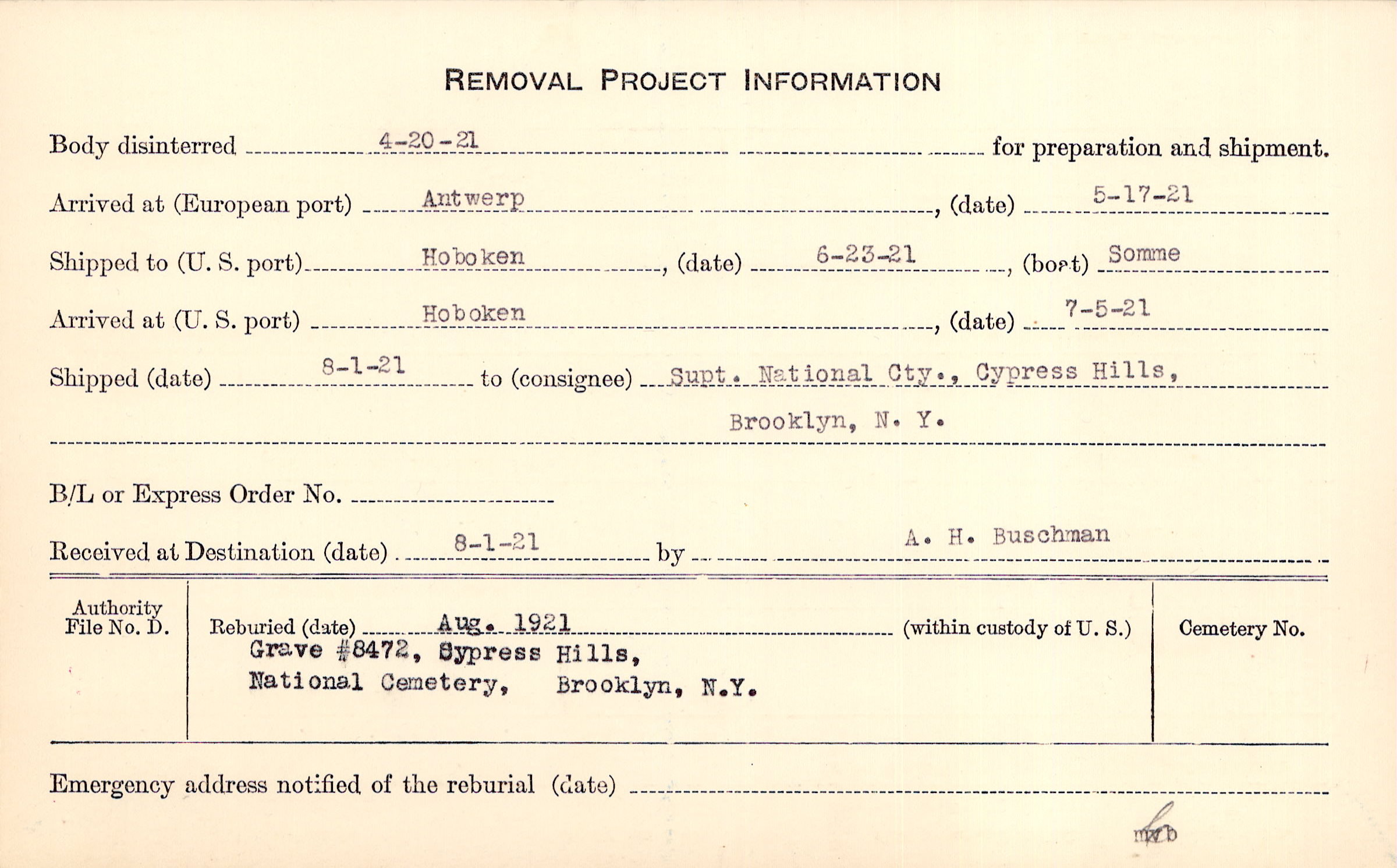 Body disinterred 4/20/1921 for preparation and shipment.