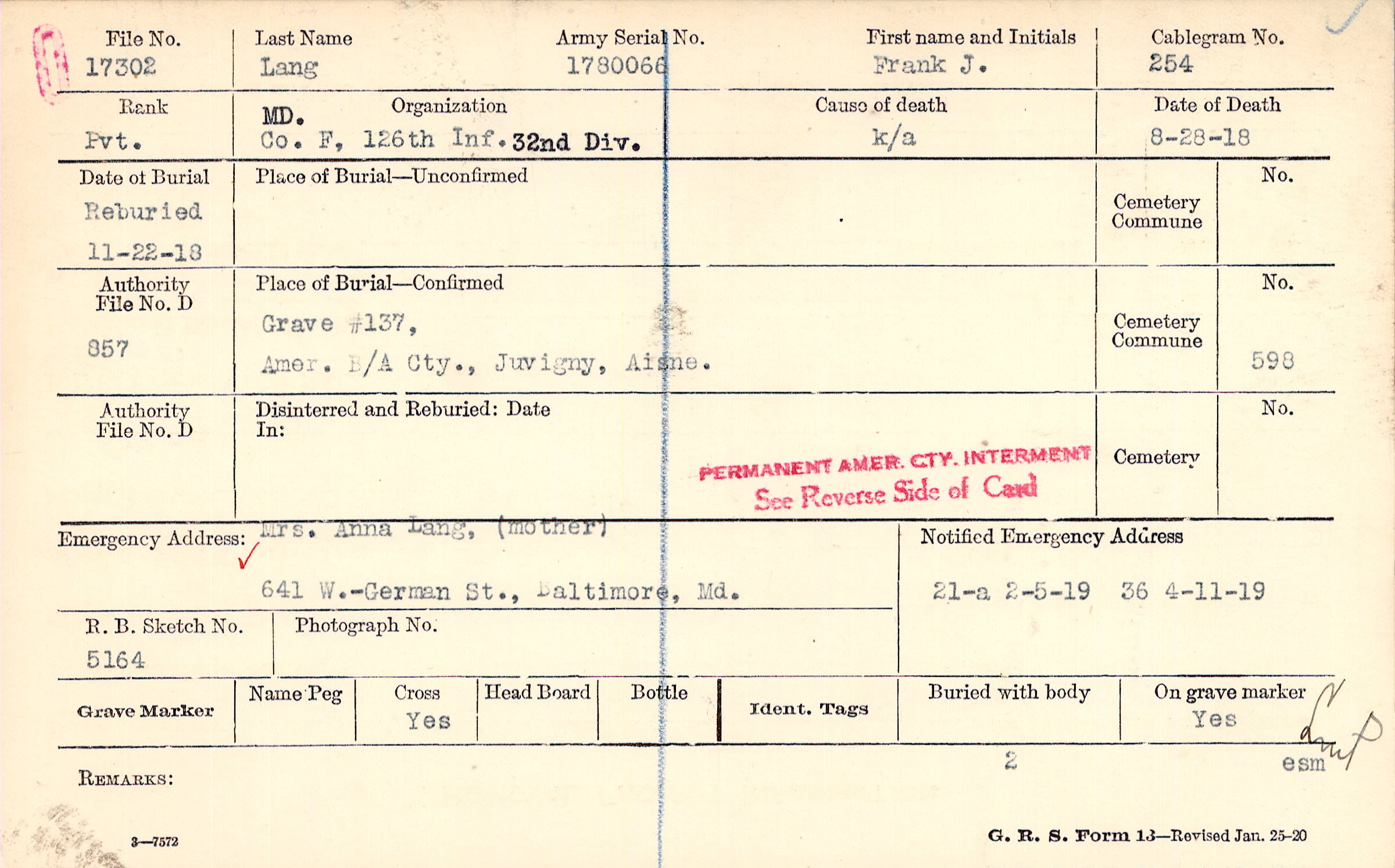Mrs. Anna Lang, (mother), 641 W.-German St., Baltimore, Md.