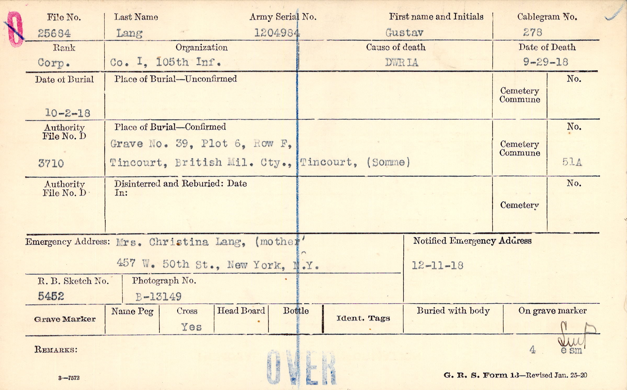 Mrs. Christina Lang, (mother, 457 W. 50th St., New York, N.Y.